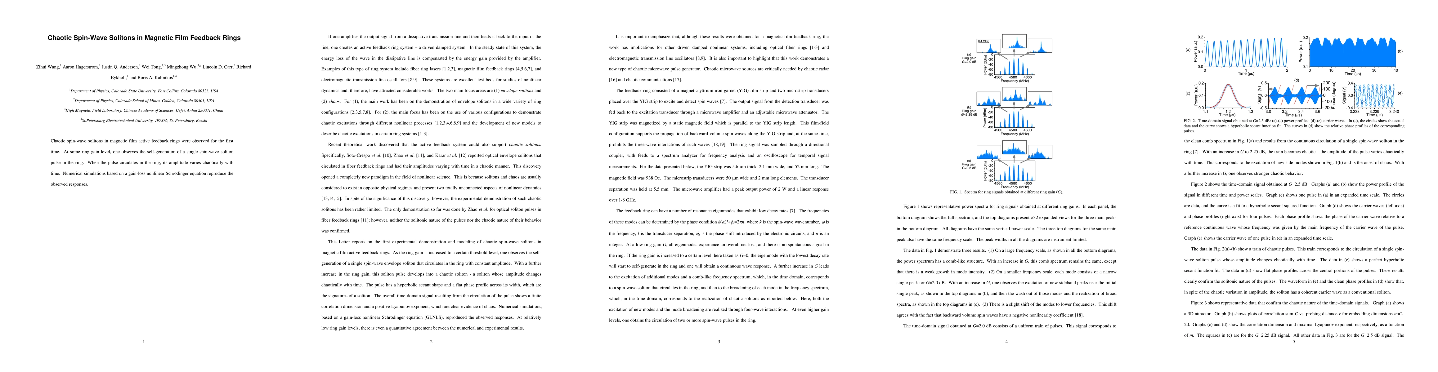 Chaotic spin-wave solitons in magnetic film active feedback rings were observed for the first time. At some ring gain level, one observes the self-generation of a single spin-wave soliton pulse in the ring. When the pulse circulates in the ring, its amplitude varies chaotically with time. Numerical simulations based on a gain-loss nonlinear Schr\"odinger equation reproduce the observed responses.