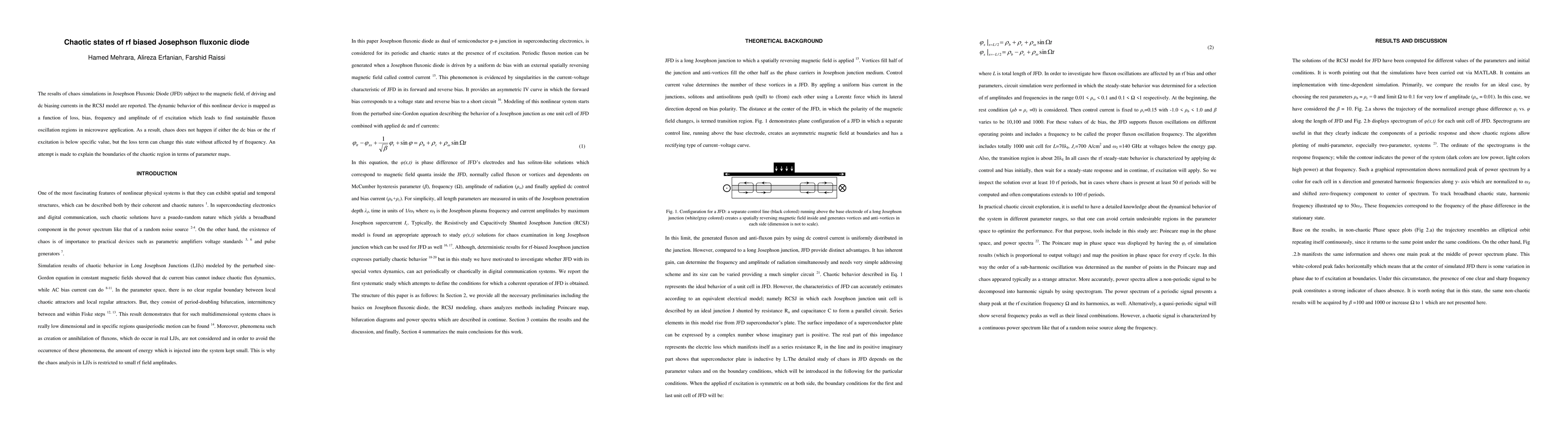 The results of chaos simulations in Josephson Fluxonic Diode (JFD) subject to the magnetic field, rf driving and dc biasing currents in the RCSJ model are reported. The dynamic behavior of this nonlinear device is mapped as a function of loss, bias, frequency and amplitude of rf excitation which leads to find sustainable fluxon oscillation regions in microwave application. As a result, chaos does not happen if either the dc bias or the rf excitation is below specific value, but the loss term can change this state without affected by rf frequency. An attempt is made to explain the boundaries of the chaotic region in terms of parameter maps.