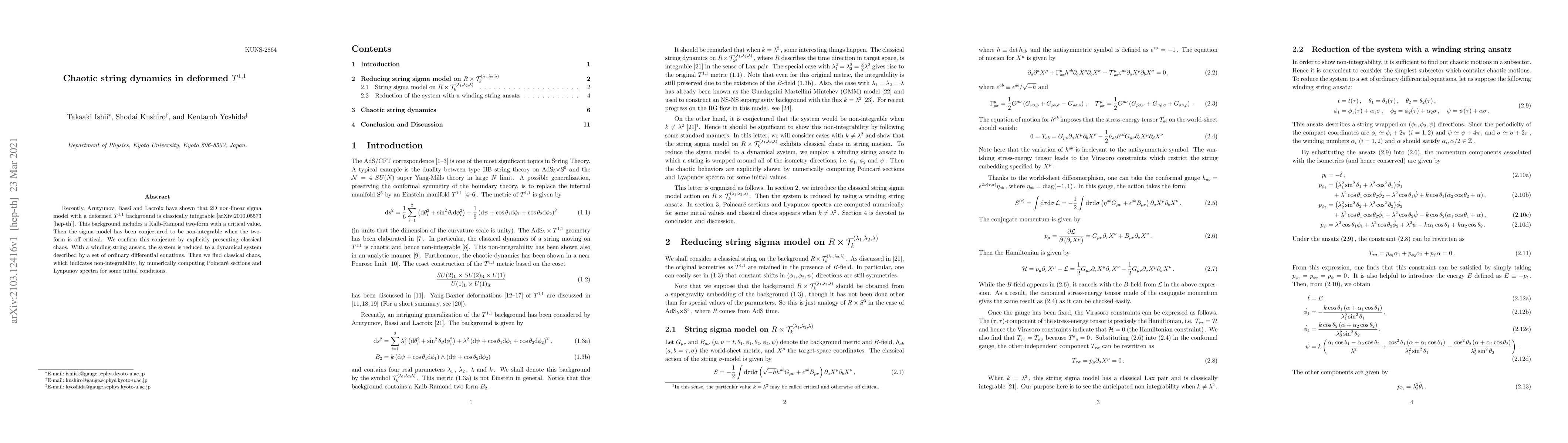 This paper confirms the conjecture that a 2D non-linear sigma model with a deformed $T^{1,1}$ background, when the Kalb-Ramond two-form is off critical, exhibits classical chaos, indicating non-integrability. Numerical analysis of Poincaré sections and Lyapunov spectra reveals the presence of classical chaos.
