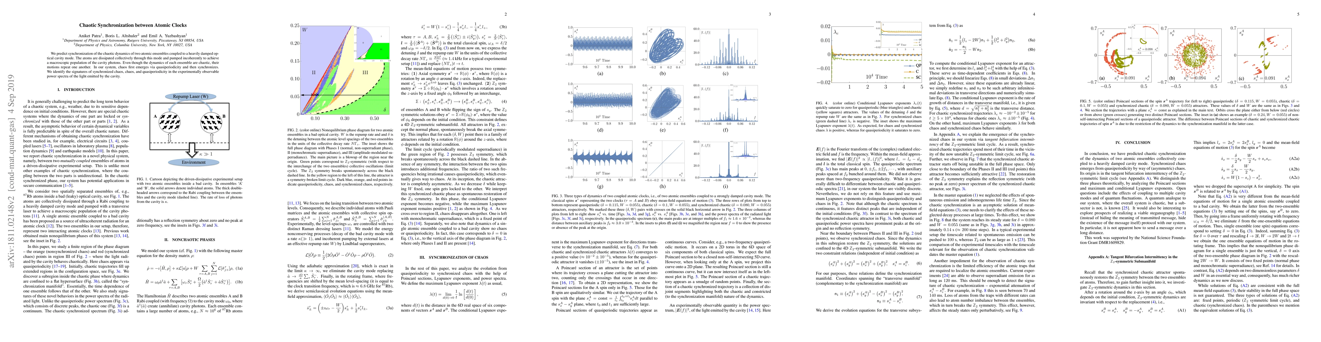 We predict synchronization of the chaotic dynamics of two atomic ensembles coupled to a heavily damped optical cavity mode. The atoms are dissipated collectively through this mode and pumped incoherently to achieve a macroscopic population of the cavity photons. Even though the dynamics of each ensemble are chaotic, their motions repeat one another. In our system, chaos first emerges via quasiperiodicity and then synchronizes. We identify the signatures of synchronized chaos, chaos, and quasiperiodicity in the experimentally observable power spectra of the light emitted by the cavity.
