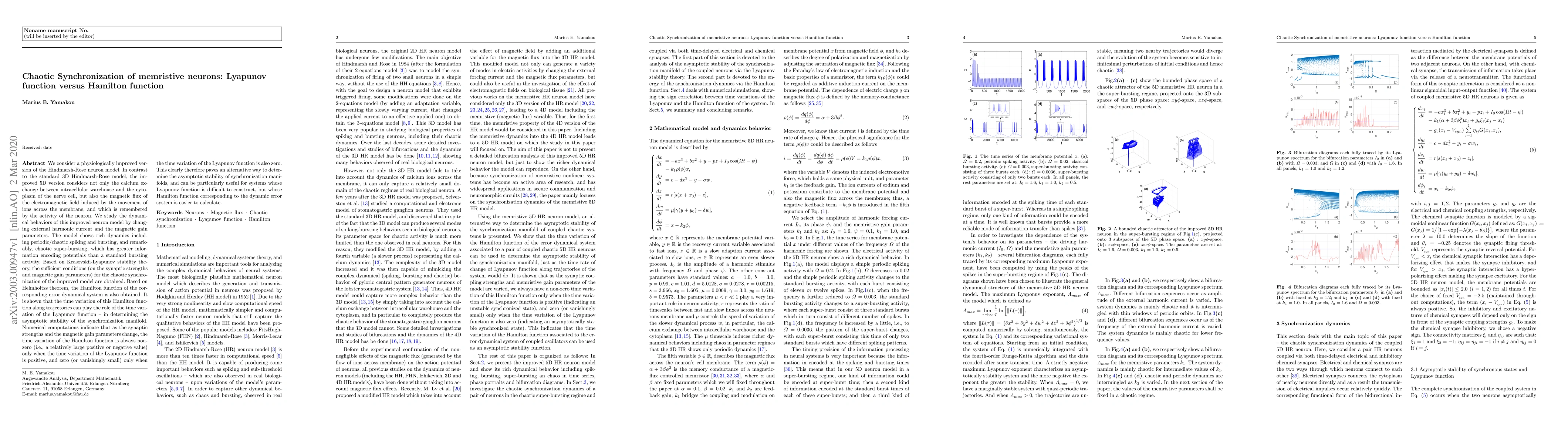 We study the dynamical behaviors of this improved memristive neuron model by changing external harmonic current and the magnetic gain parameters. The model shows rich dynamics including periodic and chaotic spiking and bursting, and remarkably, chaotic super-bursting, which has greater information encoding potentials than a standard bursting activity. Based on Krasovskii-Lyapunov stability theory, the sufficient conditions (on the synaptic strengths and magnetic gain parameters) for the chaotic synchronization of the improved model are obtained. Based on Helmholtz's theorem, the Hamilton function of the corresponding error dynamical system is also obtained. It is shown that the time variation of this Hamilton function along trajectories can play the role of the time variation of the Lyapunov function - in determining the asymptotic stability of the synchronization manifold. Numerical computations indicate that as the synaptic strengths and the magnetic gain parameters change, the time variation of the Hamilton function is always non-zero (i.e., a relatively large positive or negative value) only when the time variation of the Lyapunov function is positive, and zero (or vanishingly small) only when the time variation of the Lyapunov function is also zero. This clearly therefore paves an alternative way to determine the asymptotic stability of synchronization manifolds, and can be particularly useful for systems whose Lyapunov function is difficult to construct, but whose Hamilton function corresponding to the dynamic error system is easier to calculate.