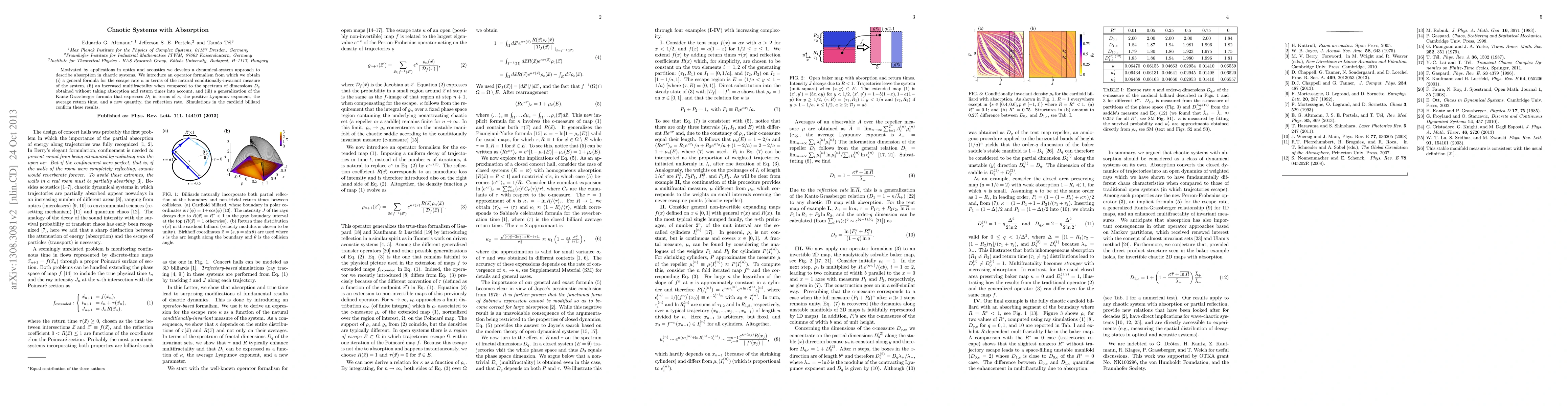 Motivated by applications in optics and acoustics we develop a dynamical-system approach to describe absorption in chaotic systems. We introduce an operator formalism from which we obtain (i) a general formula for the escape rate $\kappa$ in terms of the natural conditionally-invariant measure of the system; (ii) an increased multifractality when compared to the spectrum of dimensions $D_q$ obtained without taking absorption and return times into account; and (iii) a generalization of the Kantz-Grassberger formula that expresses $D_1$ in terms of $\kappa$, the positive Lyapunov exponent, the average return time, and a new quantity, the reflection rate. Simulations in the cardioid billiard confirm these results.