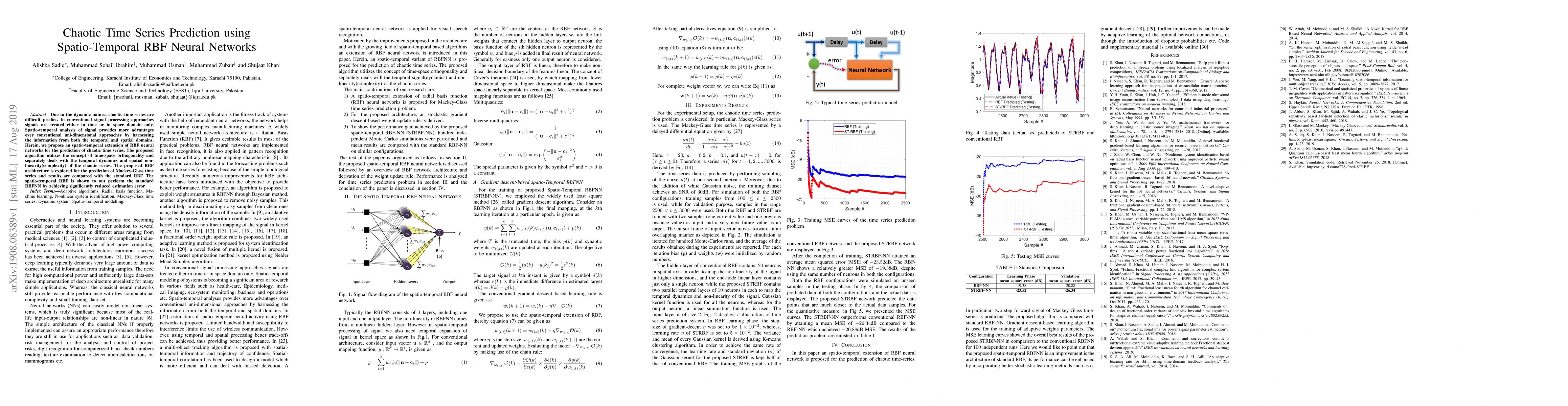 This paper proposes a spatio-temporal extension of Radial Basis Function (RBF) neural networks for predicting chaotic time series, leveraging both temporal and spatial information. The new RBF architecture, which separates temporal dynamics and spatial non-linearity, outperforms standard RBF networks in predicting the Mackey-Glass time series with significantly reduced estimation error.