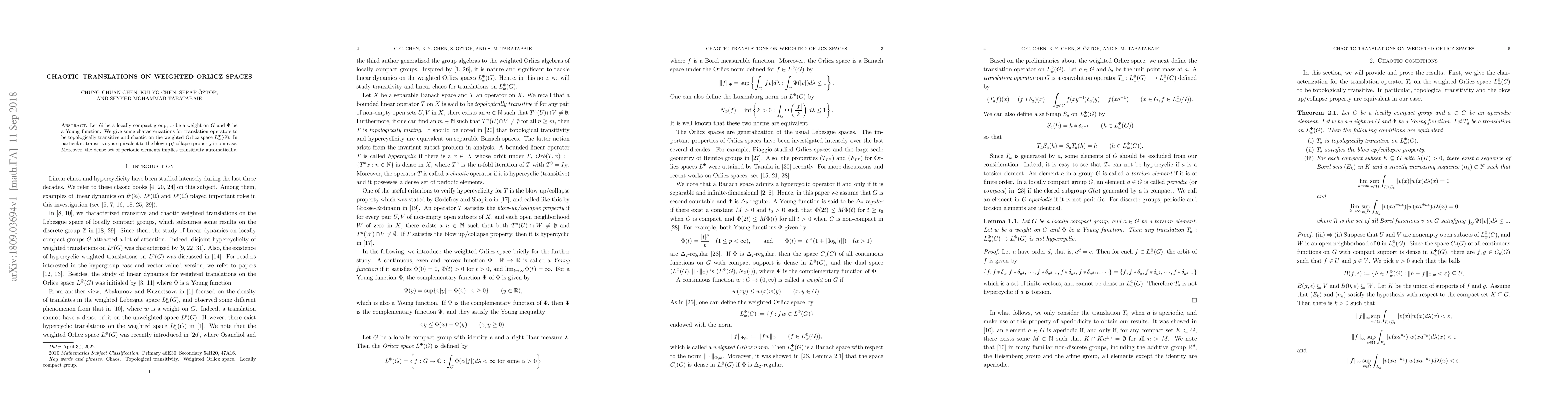 Let $G$ be a locally compact group, $w$ be a weight on $G$ and $\Phi$ be a Young function. We give some characterizations for translation operators to be topologically transitive and chaotic on the weighted Orlicz space $L_w^\Phi(G)$. In particular, transitivity is equivalent to the blow-up/collapse property in our case. Moreover, the dense set of periodic elements implies transitivity automatically.