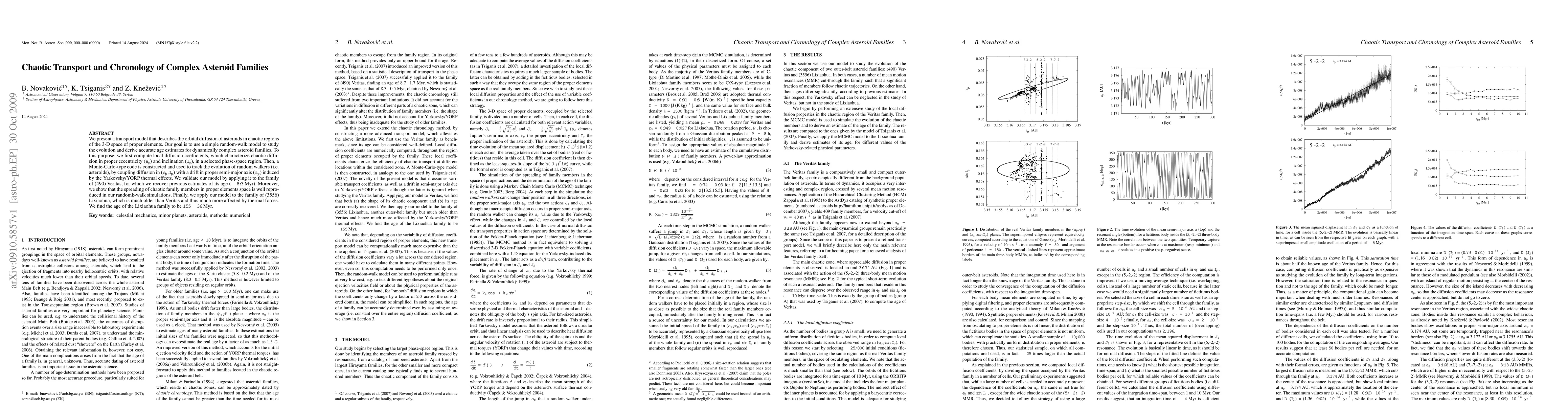 We present a transport model that describes the orbital diffusion of asteroids in chaotic regions of the 3-D space of proper elements. Our goal is to use a simple random-walk model to study the evolution and derive accurate age estimates for dynamically complex asteroid families. To this purpose, we first compute local diffusion coefficients, which characterize chaotic diffusion in proper eccentricity (e_p) and inclination (I_p), in a selected phase-space region. Then, a Monte-Carlo-type code is constructed and used to track the evolution of random walkers (i.e. asteroids), by coupling diffusion in (e_p,I_p) with a drift in proper semi-major axis (a_p) induced by the Yarkovsky/YORP thermal effects. We validate our model by applying it to the family of (490) Veritas, for which we recover previous estimates of its age (~8.3 Myr). Moreover, we show that the spreading of chaotic family members in proper elements space is well reproduced in our random-walk simulations. Finally, we apply our model to the family of (3556) Lixiaohua, which is much older than Veritas and thus much more affected by thermal forces. We find the age of the Lixiaohua family to be 155+/-36 Myr.