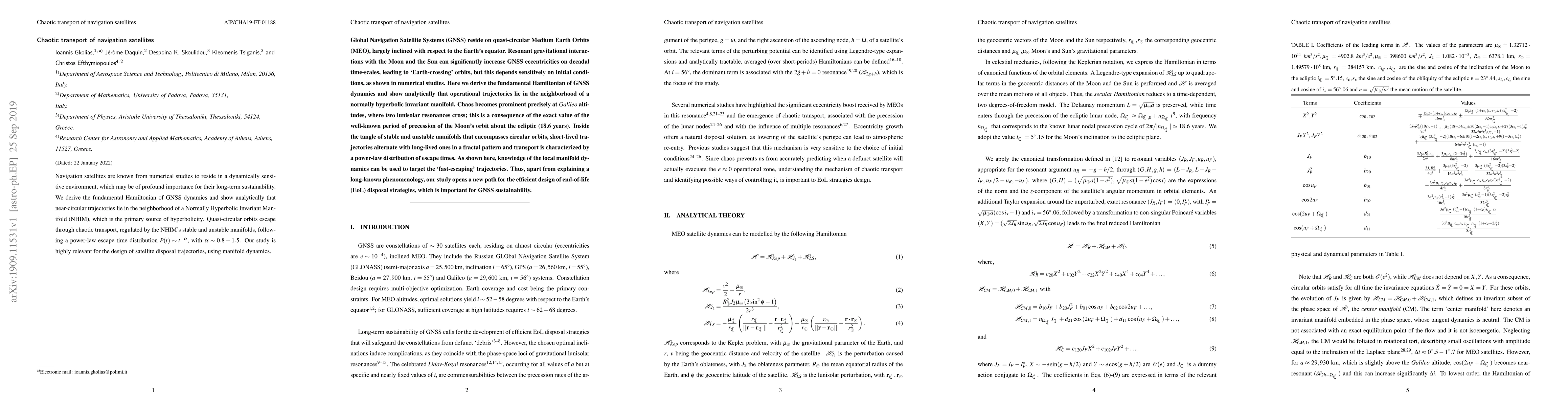 Navigation satellites exhibit chaotic transport due to their sensitive environment, with escape times following a power-law distribution, relevant for designing satellite disposal trajectories.