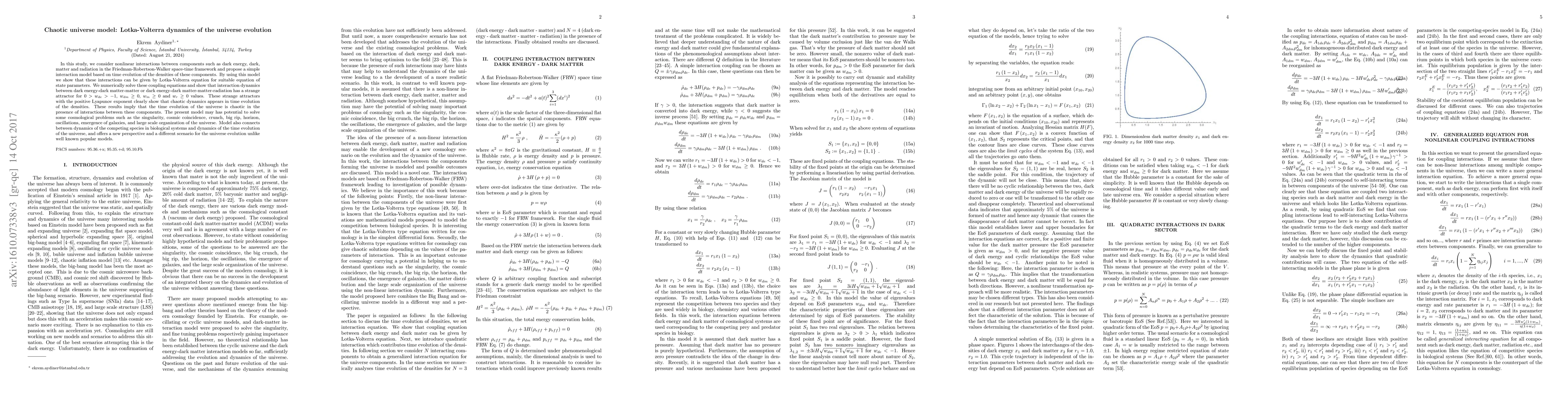 In this study, we consider nonlinear interactions between components such as dark energy, dark, matter and radiation in the Friedman-Robertson-Walker space-time framework and propose a simple interaction model based on time evolution of the densities of these components. By using this model we show that these interactions can be given by Lotka-Volterra equation for suitable equation of state parameters. We numerically solve these coupling equations and show that interaction dynamics between dark energy-dark matter-matter or dark energy-dark matter-matter-radiation has a strange attractor for $0>w_{de}>-1$, $w_{dm}\ge 0$, $w_{m}\ge 0$ and $w_{r}\ge 0$ values. These strange attractors with the positive Lyapunov exponent clearly show that chaotic dynamics appears in time evolution of the densities. These results imply that the time evolution of the universe is chaotic in the presence of interactions between these components. The present model may has potential to solve some cosmological problems such as the singularity, cosmic coincidence, crunch, big rip, horizon, oscillations, emergence of galaxies, and large scale organization of the universe. Model also connects between dynamics of the competing species in biological systems and dynamics of the time evolution of the universe, and offers a new perspective and a different scenario for the universe evolution unlike well known popular models.