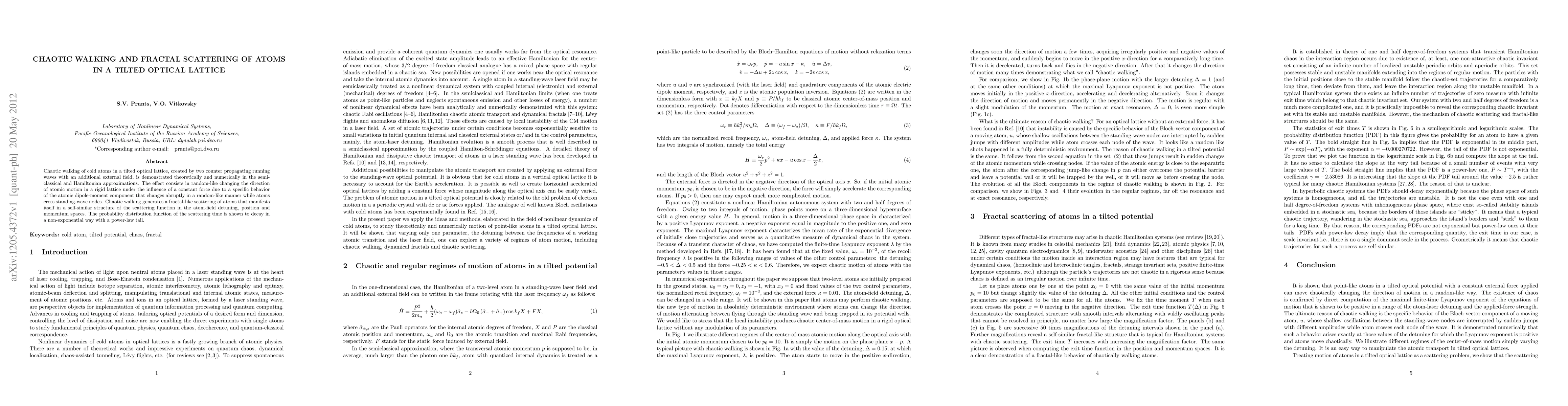 This paper demonstrates chaotic walking of cold atoms in a tilted optical lattice, showing fractal scattering patterns due to random changes in atomic motion direction. The study reveals a power-law decay in the scattering time probability distribution, indicating non-exponential behavior.
