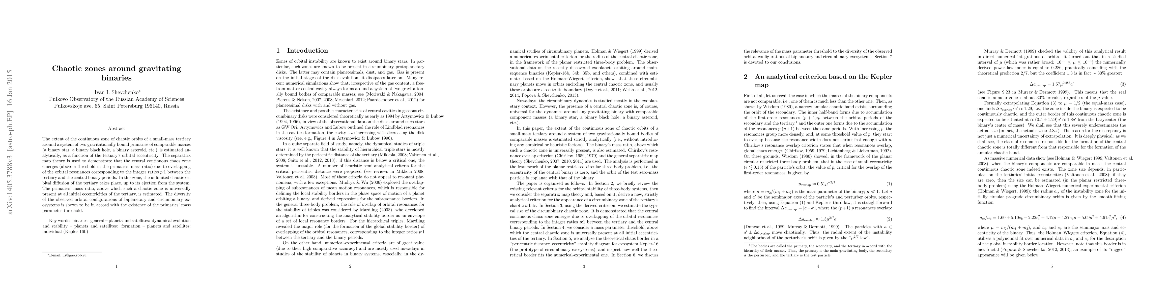 This paper analytically estimates the extent of chaotic orbital zones for a small-mass tertiary around gravitating binaries, demonstrating that a continuous chaos zone emerges due to overlapping orbital resonances above a certain mass ratio threshold. The study shows that this chaotic zone leads to the tertiary's potential ejection, aligning with observed orbital configurations in biplanetary and circumbinary systems.