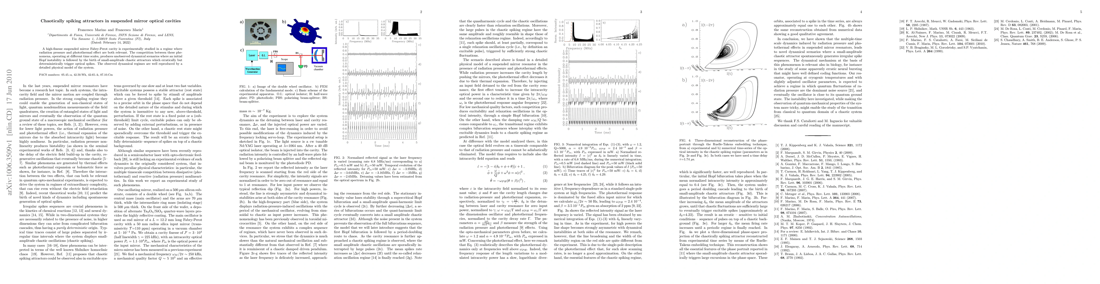 A high-finesse suspended mirror Fabry-Perot cavity is experimentally studied in a regime where radiation pressure and photothermal effect are both relevant. The competition between these phenomena, operating at different time scales, produces unobserved dynamical scenarios where an initial Hopf instability is followed by the birth of small-amplitude chaotic attractors which erratically but deterministically trigger optical spikes. The observed dynamical regimes are well reproduced by a detailed physical model of the system.