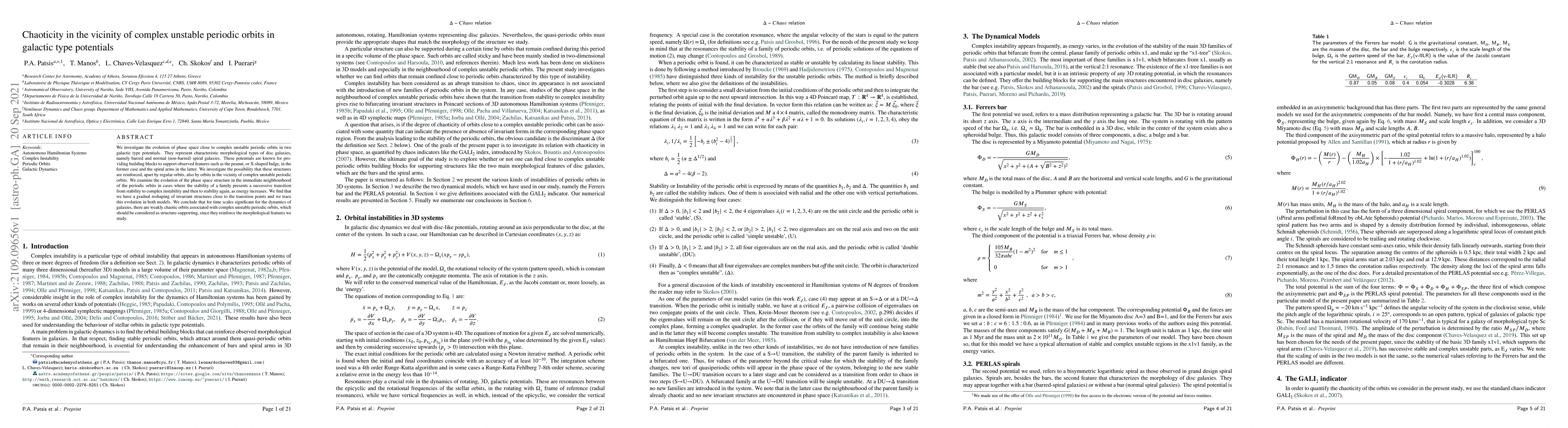 This paper examines the phase space dynamics near complex unstable periodic orbits in barred and non-barred spiral galaxy models, finding that these orbits support and reinforce galactic structures like X-shaped bulges and spiral arms through weakly chaotic orbits. The study reveals a gradual reshaping of invariant structures during transitions between stability and instability.