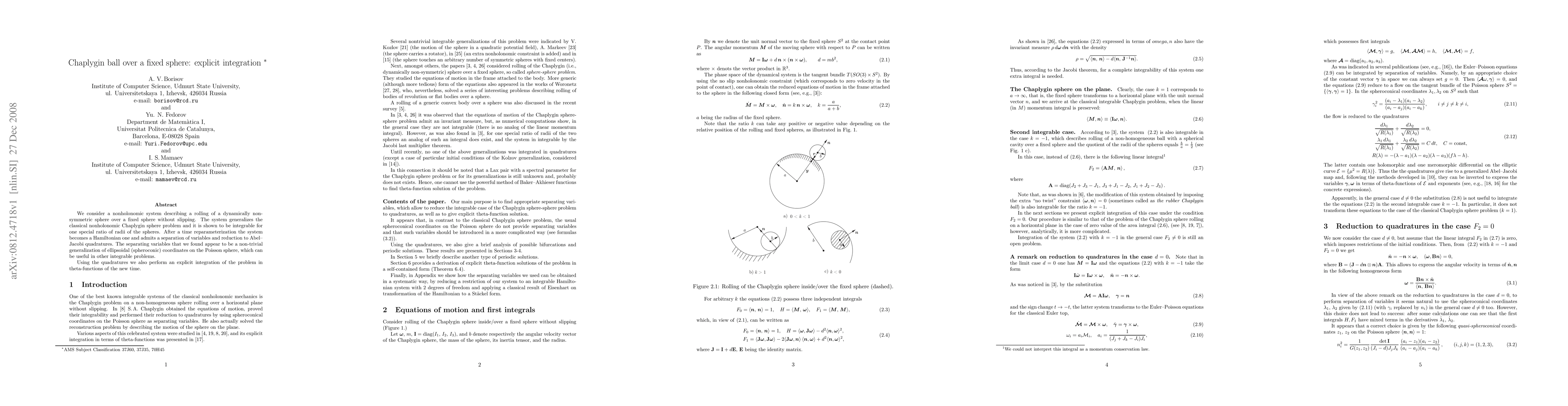 This paper explores the integrable dynamics of a nonholonomic Chaplygin ball rolling over a fixed sphere, revealing a special ratio of radii that allows for explicit integration. The system is transformed into a Hamiltonian form, leading to a separation of variables and reduction to Abel-Jacobi quadratures, with new generalized ellipsoidal coordinates facilitating further integrable problems.