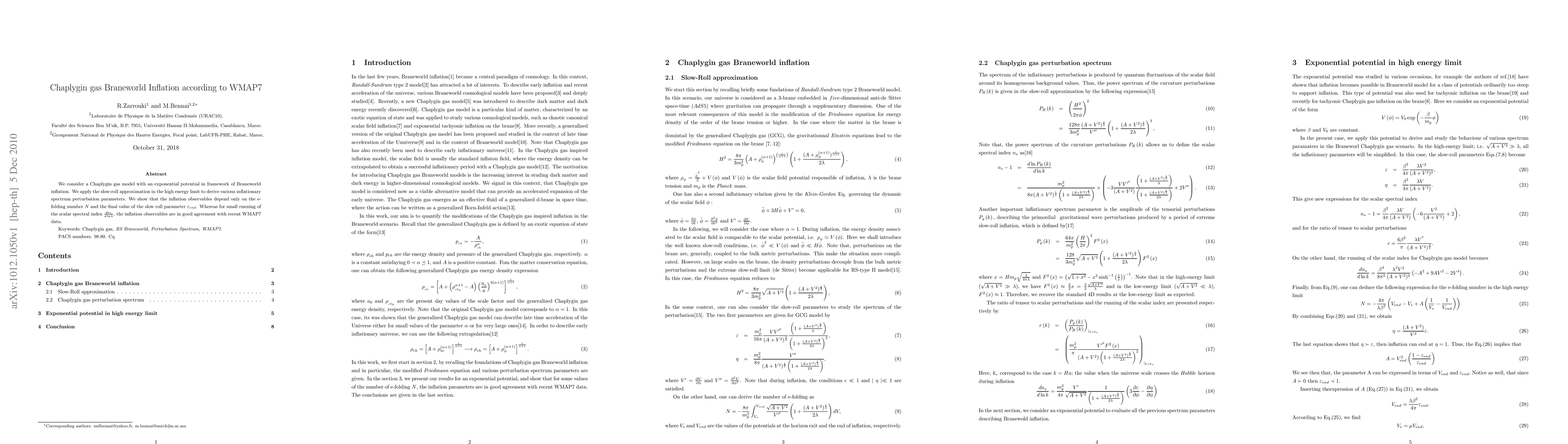 This paper explores a Chaplygin gas model with an exponential potential in the context of braneworld inflation, deriving inflationary spectrum parameters using the slow-roll approximation. It finds that inflation observables align well with WMAP7 data for small scalar spectral index running.