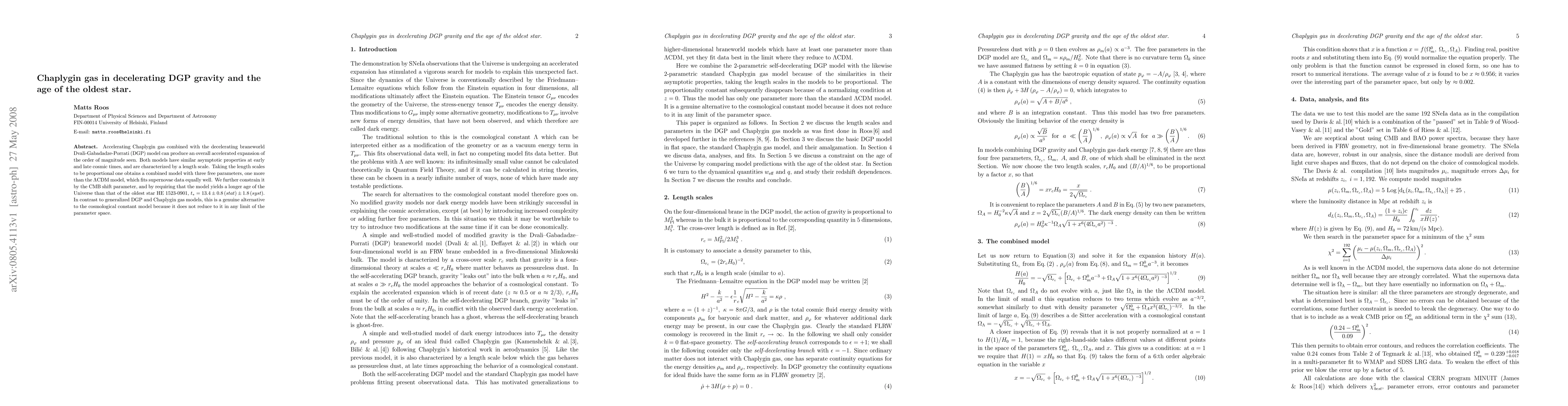 Accelerating Chaplygin gas combined with the decelerating braneworld Dvali-Gabadadze-Porrati (DGP) model can produce an overall accelerated expansion of the order of magnitude seen. Both models have similar asymptotic properties at early and late cosmic times, and are characterized by a length scale. Taking the length scales to be proportional one obtains a combined model with three free parameters, one more than the LCDM model, which fits supernovae data equally well. We further constrain it by the CMB shift parameter, and by requiring that the model yields a longer age of the Universe than that of the oldest star HE 1523-0901, t * = 13.4\pm 0.8(stat)\pm 1.8(syst). In contrast to generalized DGP and Chaplygin gas models, this is a genuine alternative to the cosmological constant model because it does not reduce to it in any limit of the parameter space.