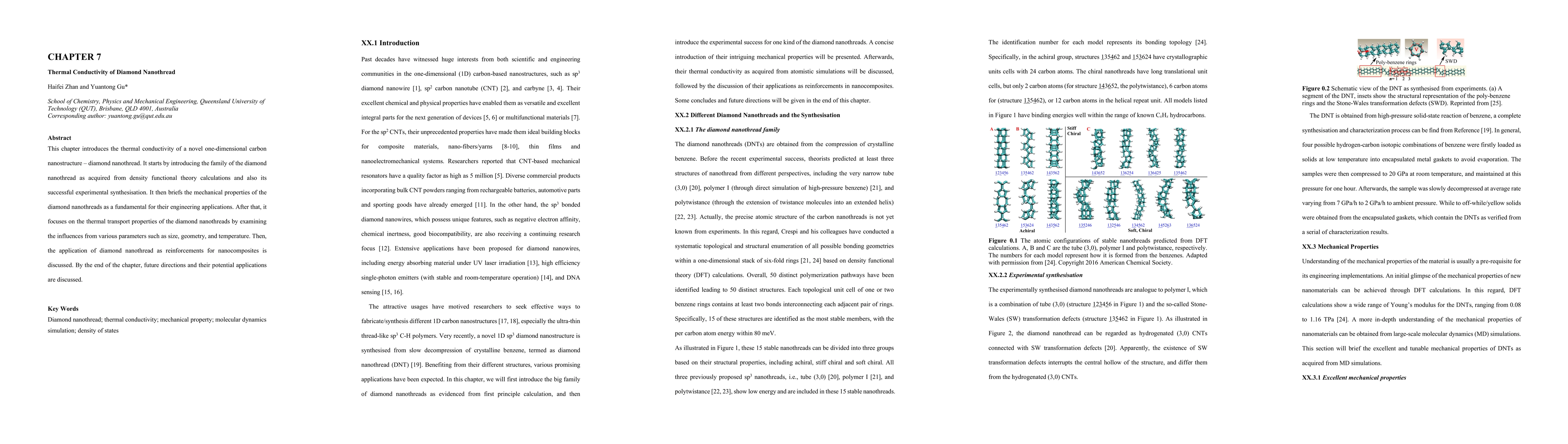 This chapter explores the thermal conductivity of diamond nanothreads, a novel one-dimensional carbon nanostructure, detailing its synthesis, mechanical properties, and thermal transport influences. It also discusses potential applications in nanocomposites and future research directions.