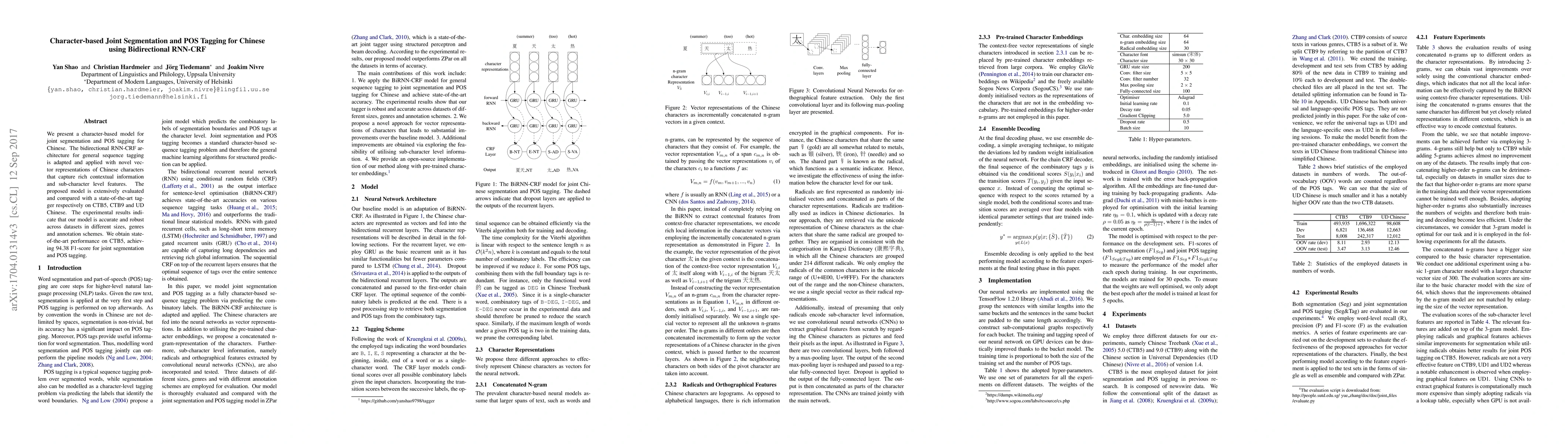 This paper proposes a character-based bidirectional RNN-CRF model for joint Chinese word segmentation and POS tagging, utilizing novel vector representations to capture contextual information. The model achieves state-of-the-art performance on CTB5 with a 94.38 F1-score, demonstrating accuracy and robustness across various datasets.