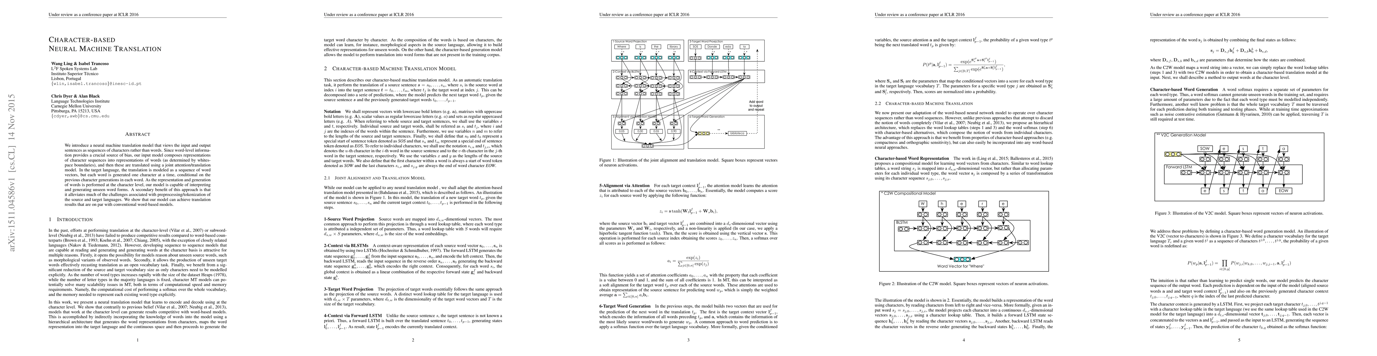 This paper proposes a character-based neural machine translation model that translates sentences at the character level, enabling it to handle unseen word forms and reducing preprocessing/tokenization challenges. The model achieves comparable translation results to conventional word-based models.