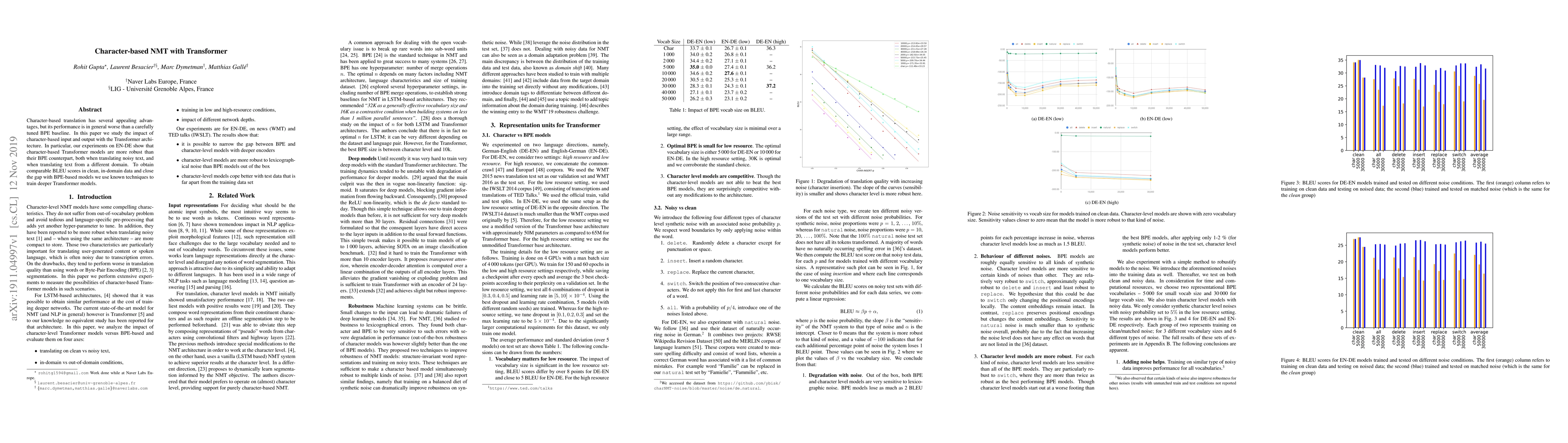 Character-based translation with Transformer models outperforms BPE counterparts in robustness to noise and domain shifts. Deeper Transformer models can achieve comparable BLEU scores in clean data.