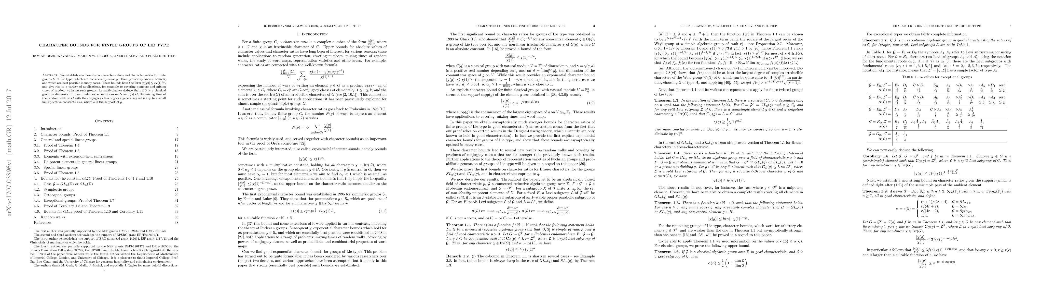 This paper establishes new, stronger bounds on character values and ratios for finite groups of Lie type, expressed as $|\chi(g)| \le \chi(1)^{\alpha_g}$. These bounds apply to various applications like covering numbers and mixing times of random walks, notably showing that the mixing time for classical groups in dimension $n$ is (up to a small constant) $n/s$, where $s$ is the support of the generating element $g$.