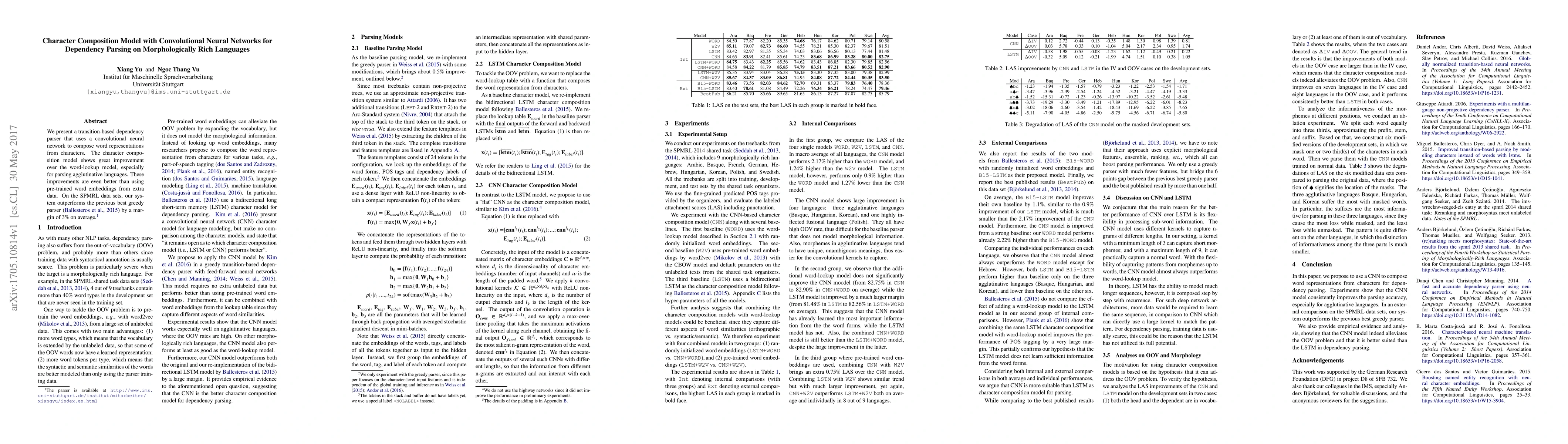 This paper introduces a convolutional neural network-based character composition model for dependency parsing, significantly improving parsing accuracy for morphologically rich languages, outperforming previous methods by a 3% margin on average in the SPMRL datasets. The model's success highlights its effectiveness over word-lookup and pre-trained embeddings.