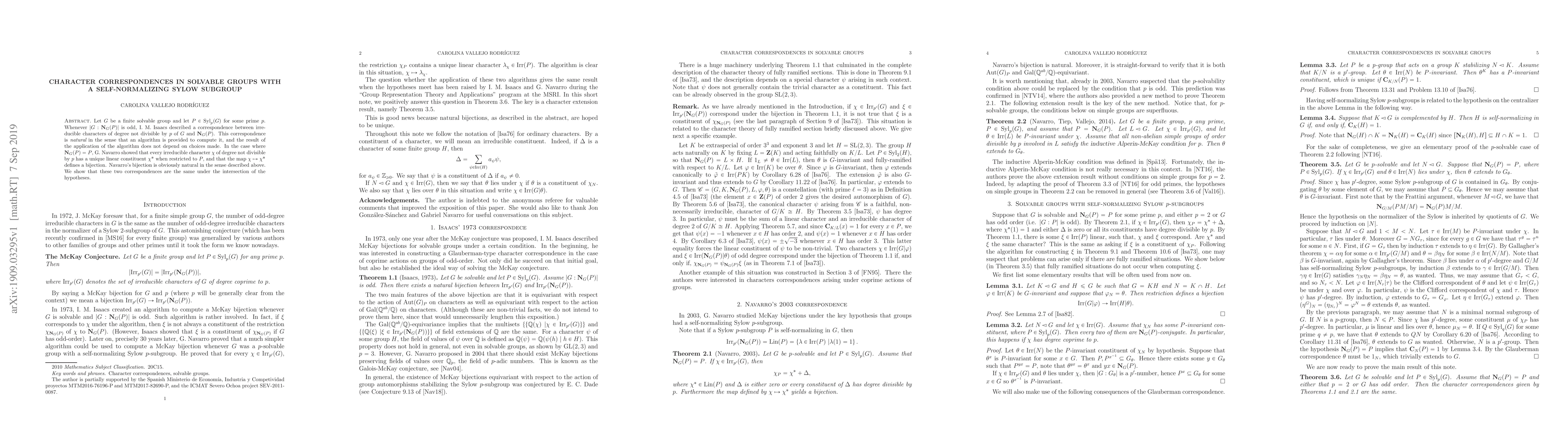 In 1973, I. M. Isaacs described a correspondence between characters of degree not divisible by a fixed prime $p$ of a finite solvable group $G$ and those of the normalizer of Sylow $p$-subgroup of $G$, whenever the index of the normalizer in $G$ is odd. This correspondence is natural in the sense that an algorithm is provided to compute it, and the result of the application of the algorithm does not depend on choices made. Later on, for $p$-solvable groups with self-normalizing Sylow $p$-subgroup, G. Navarro showed that every irreducible character of degree not divisible by $p$ has a unique linear constituent when restricted to a Sylow $p$-subgroup. Furthermore, the process of choosing the unique linear constituent of the restriction defines a bijection. Navarro's bijection is obviously natural in the sense described above. We show that these two correspondences are the same under the intersection of the hypotheses.