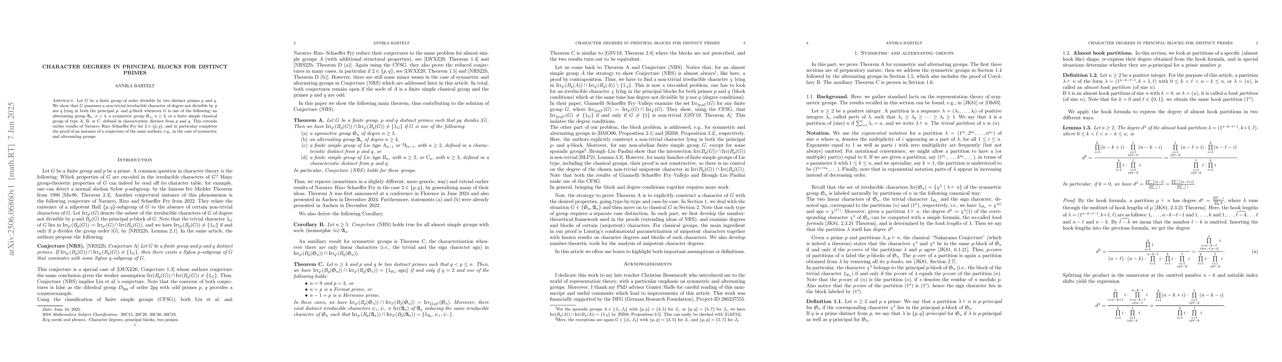 This paper proves that for specific finite groups like alternating and symmetric groups, and classical simple groups of types A, B, C, there exists a non-trivial irreducible character of degrees not divisible by two distinct primes p and q, residing in both the principal p- and q-blocks. This extends previous findings for cases where 2 is one of the primes, contributing to the proof of a conjecture by Navarro-Rizo-Schaeffer Fry.