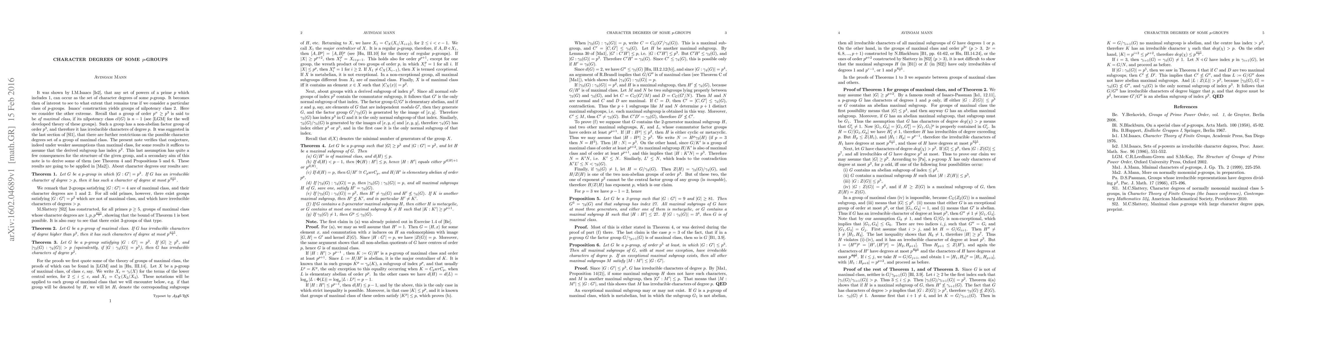This paper investigates character degrees of $p$-groups $G$ where $|G:G'| = p^2$, particularly focusing on those of maximal class. It concludes that if such groups have irreducible characters of degree greater than $p$, they possess characters of degree at most $p^{\frac{p+1}{2}}$.