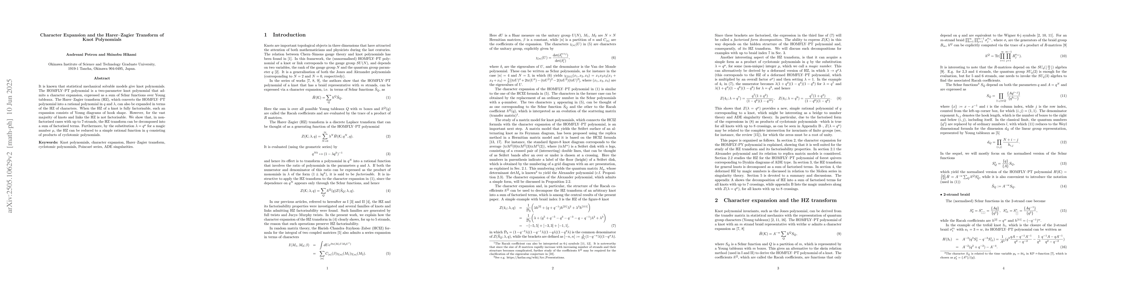 The paper explores the HOMFLY--PT polynomial's character expansion and its relation to the Harer-Zagier (HZ) transform, focusing on decomposition of non-factorisable HZ into factorised terms for links with up to 7-strands.