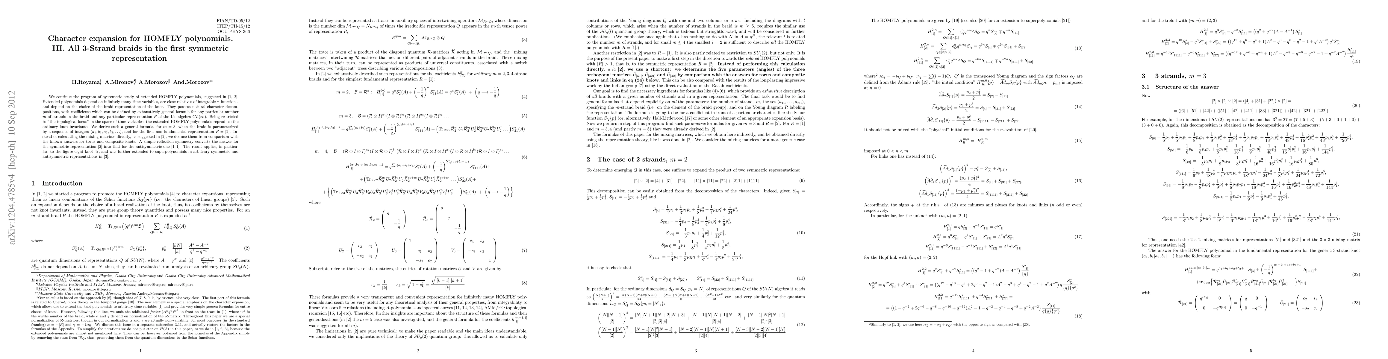 This paper derives a general formula for extended HOMFLY polynomials for 3-strand braids in the first symmetric representation, focusing on a specific sequence of integers. It leverages known results for torus and composite knots to deduce the mixing matrices without direct calculation.