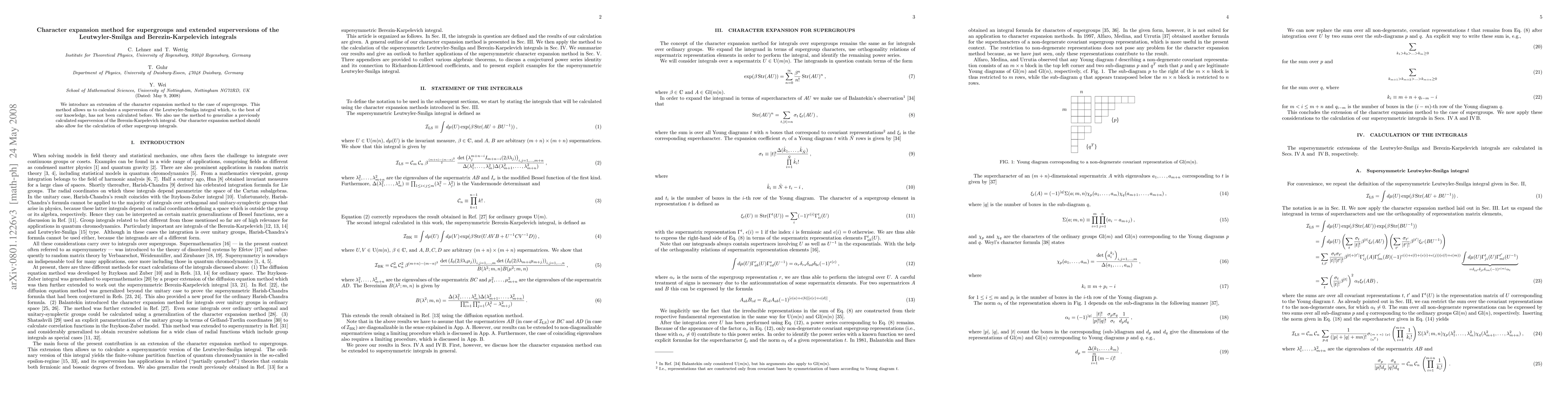 This paper extends the character expansion method to supergroups, enabling the calculation of a superversion of the Leutwyler-Smilga integral for the first time, and generalizing the previously calculated superversion of the Berezin-Karpelevich integral. The method is expected to facilitate the computation of other supergroup integrals.