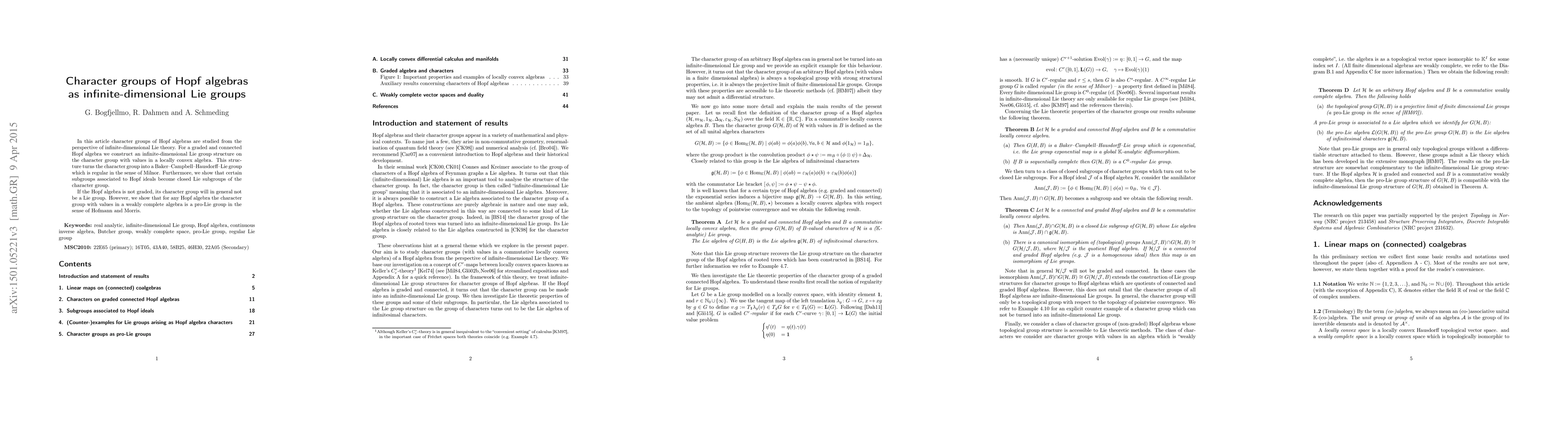 This paper constructs an infinite-dimensional Lie group structure on the character group of a graded and connected Hopf algebra, establishing it as a Baker-Campbell-Hausdorff-Lie group. It also shows that certain subgroups linked to Hopf ideals form closed Lie subgroups within this character group.