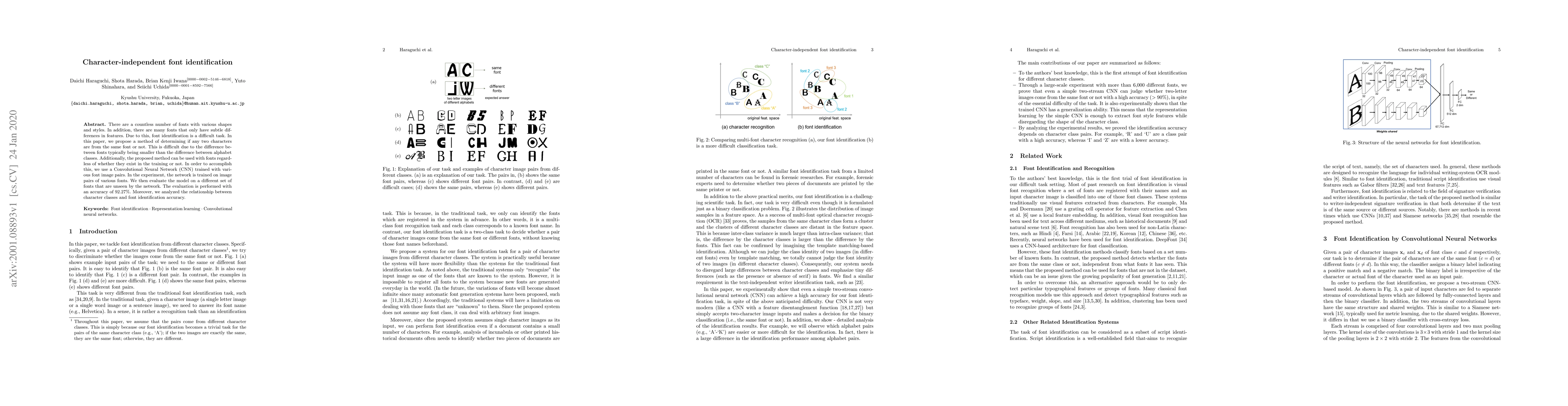 There are a countless number of fonts with various shapes and styles. In addition, there are many fonts that only have subtle differences in features. Due to this, font identification is a difficult task. In this paper, we propose a method of determining if any two characters are from the same font or not. This is difficult due to the difference between fonts typically being smaller than the difference between alphabet classes. Additionally, the proposed method can be used with fonts regardless of whether they exist in the training or not. In order to accomplish this, we use a Convolutional Neural Network (CNN) trained with various font image pairs. In the experiment, the network is trained on image pairs of various fonts. We then evaluate the model on a different set of fonts that are unseen by the network. The evaluation is performed with an accuracy of 92.27%. Moreover, we analyzed the relationship between character classes and font identification accuracy.