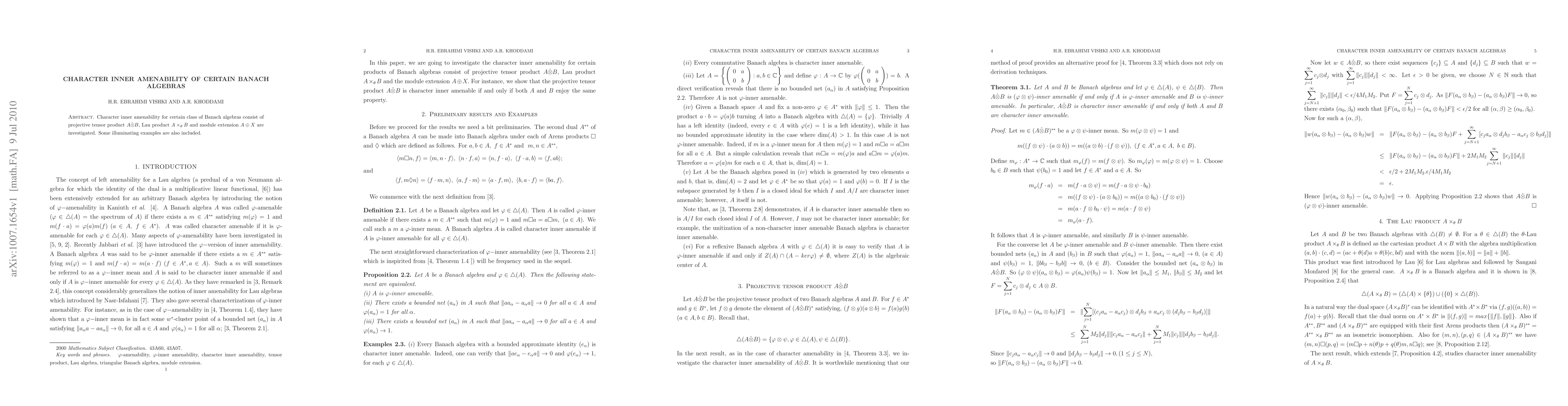 This paper investigates character inner amenability for specific Banach algebras, including projective tensor products $A\hat{\otimes}B$, Lau products $A\times_\theta B$, and module extensions $A\oplus X$, with illustrative examples provided.