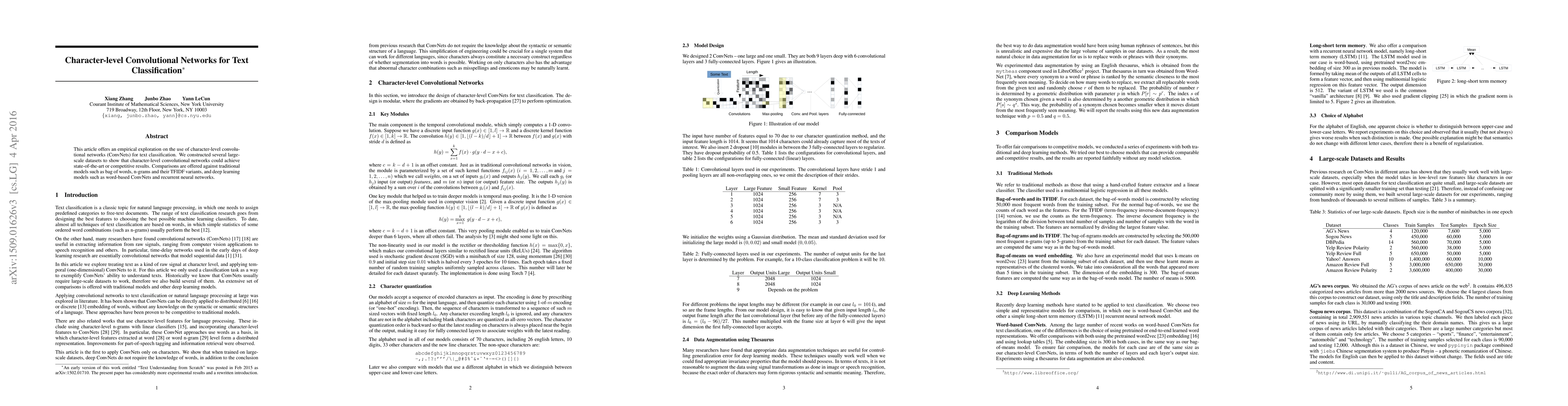 This paper investigates character-level convolutional networks for text classification, demonstrating their effectiveness through large-scale datasets and comparisons to traditional and deep learning models. The results show competitive performance of character-level ConvNets against established methods.
