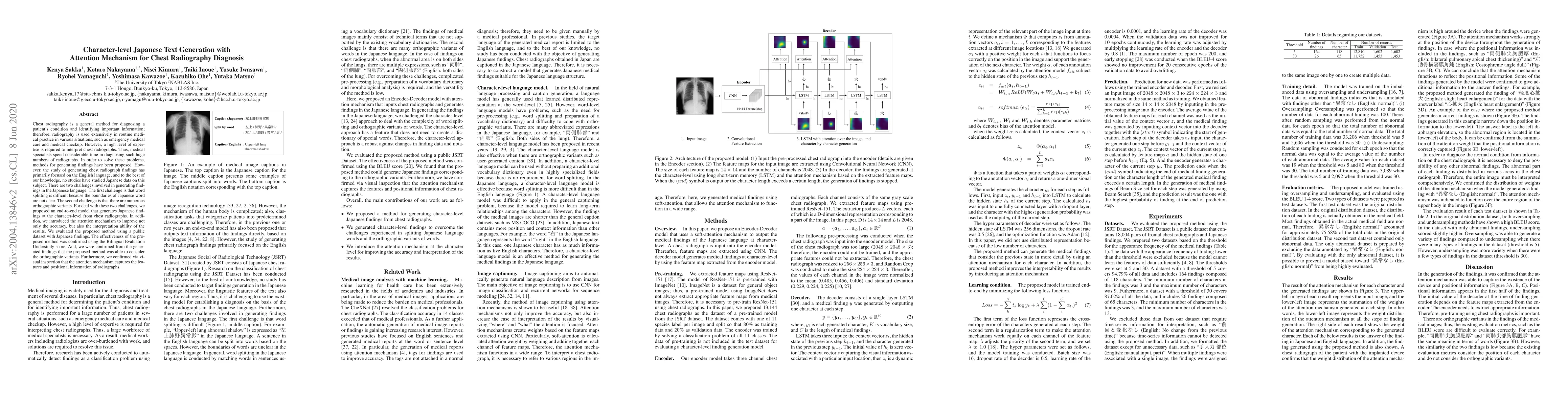 This paper proposes an end-to-end model for generating Japanese text findings from chest radiographs at the character-level, addressing the challenges of unclear word boundaries and orthographic variants. The model incorporates an attention mechanism to enhance accuracy and interpretability, demonstrating effectiveness through evaluation using a public dataset.