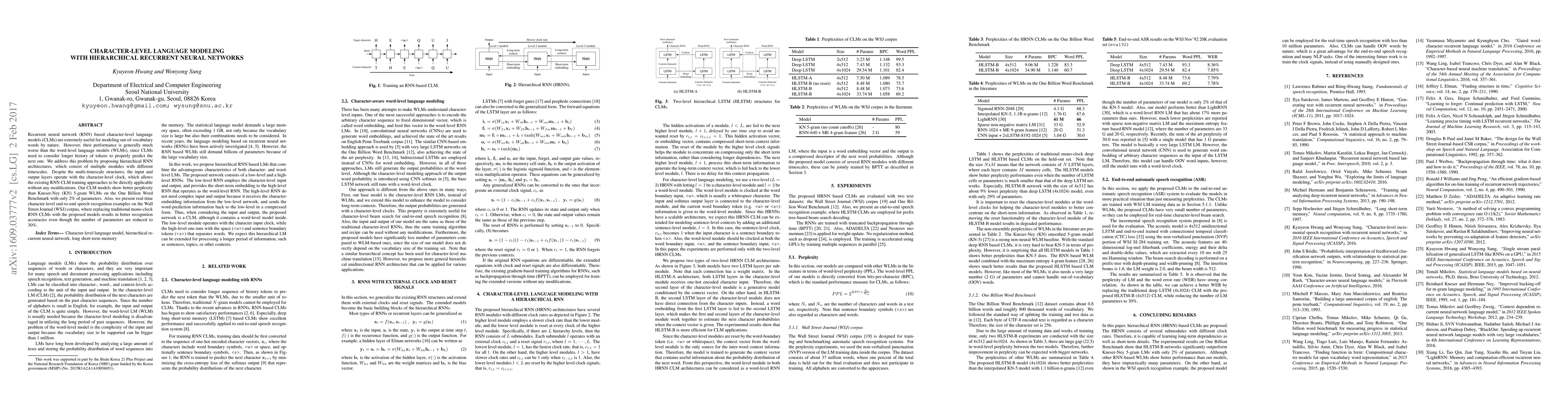 This paper proposes hierarchical recurrent neural networks for character-level language modeling, improving performance over traditional models by incorporating multi-timescale modules. The proposed models achieve better perplexity than word-level baselines with significantly fewer parameters.