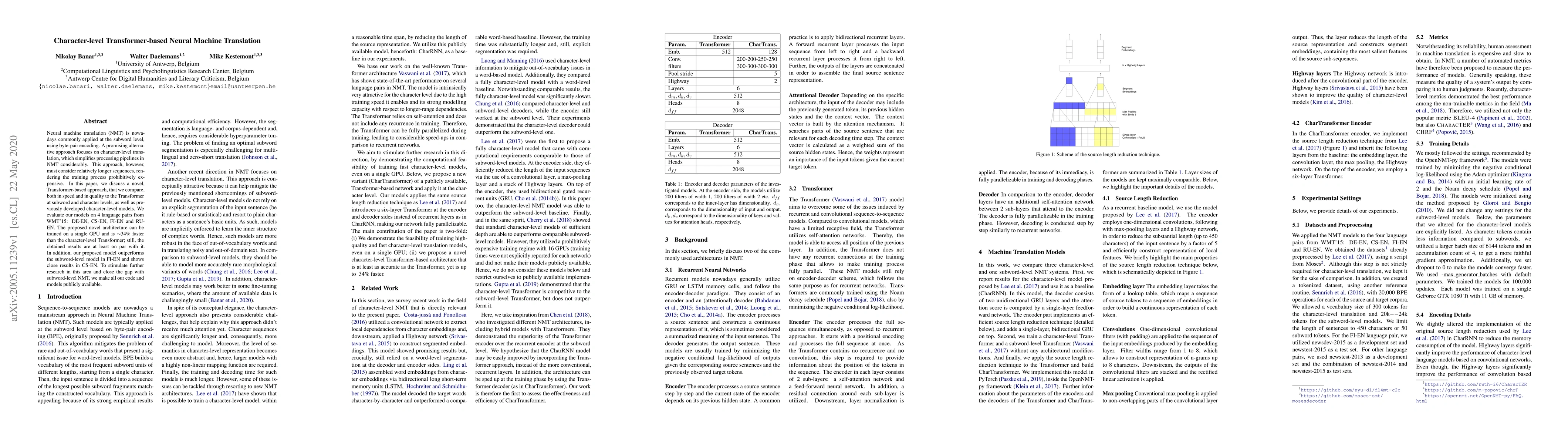 Neural machine translation (NMT) is nowadays commonly applied at the subword level, using byte-pair encoding. A promising alternative approach focuses on character-level translation, which simplifies processing pipelines in NMT considerably. This approach, however, must consider relatively longer sequences, rendering the training process prohibitively expensive. In this paper, we discuss a novel, Transformer-based approach, that we compare, both in speed and in quality to the Transformer at subword and character levels, as well as previously developed character-level models. We evaluate our models on 4 language pairs from WMT'15: DE-EN, CS-EN, FI-EN and RU-EN. The proposed novel architecture can be trained on a single GPU and is 34% percent faster than the character-level Transformer; still, the obtained results are at least on par with it. In addition, our proposed model outperforms the subword-level model in FI-EN and shows close results in CS-EN. To stimulate further research in this area and close the gap with subword-level NMT, we make all our code and models publicly available.