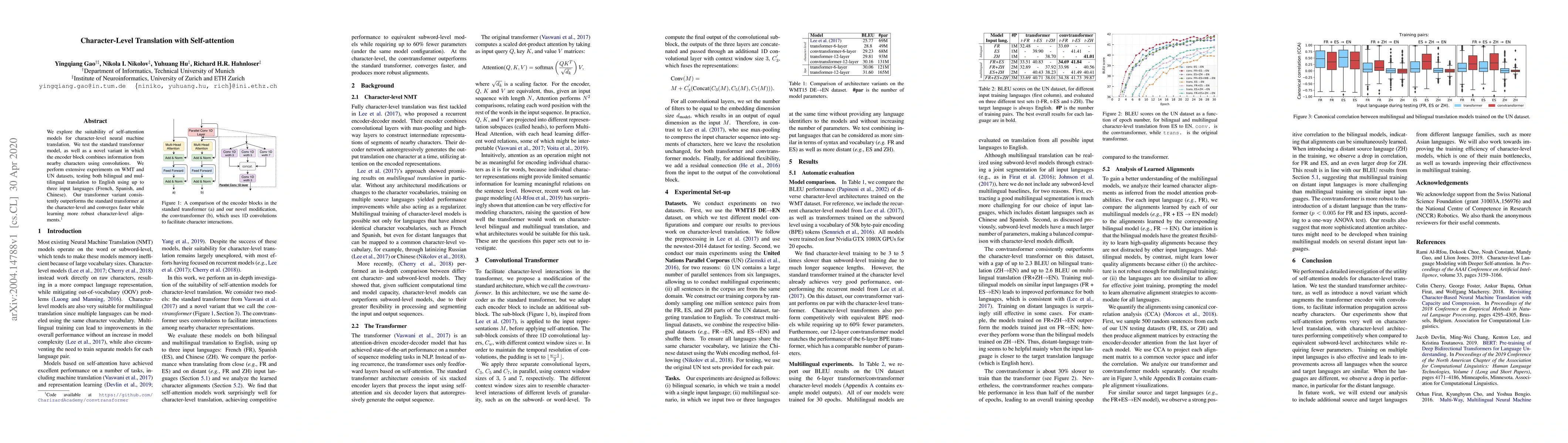 This paper investigates self-attention models for character-level neural machine translation, comparing a standard transformer model with a novel variant that uses convolutions for encoder blocks. The results show that the novel variant outperforms the standard transformer on WMT and UN datasets, achieving better character-level alignments and faster convergence.