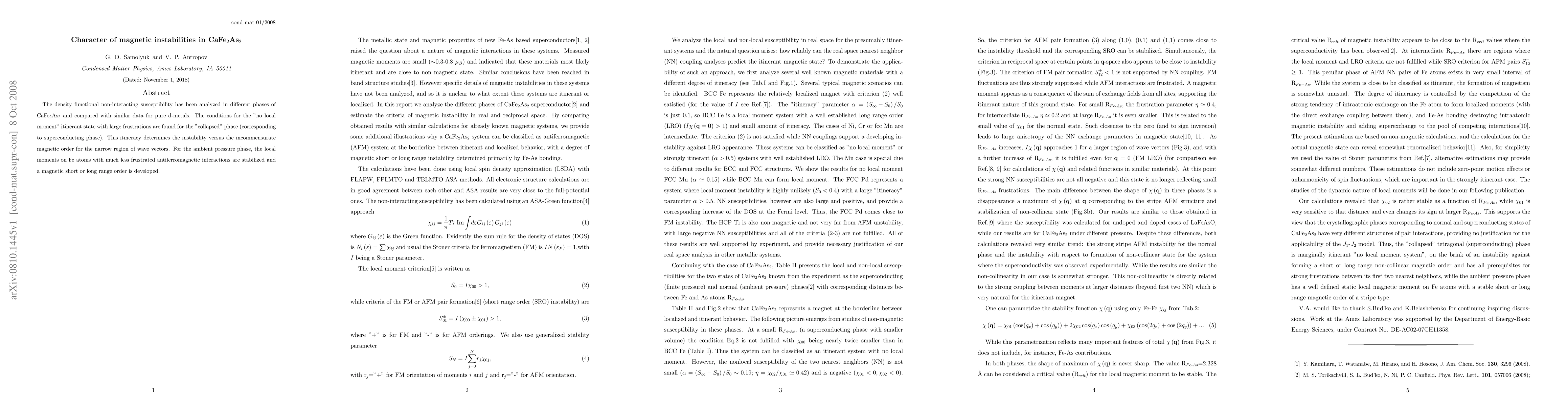 The density functional non-interacting susceptibility has been analyzed in different phases of CaFe2As2 and compared with similar data for pure d-metals. The conditions for the "no local moment" itinerant state with large frustrations are found for the "collapsed" phase (corresponding to superconducting phase). This itineracy determines the instability versus the incommensurate magnetic order for the narrow region of wave vectors. For the ambient pressure phase, the local moments on Fe atoms with much less frustrated antiferromagnetic interactions are stabilized and a magnetic short or long range order for all wave vectors is developed.
