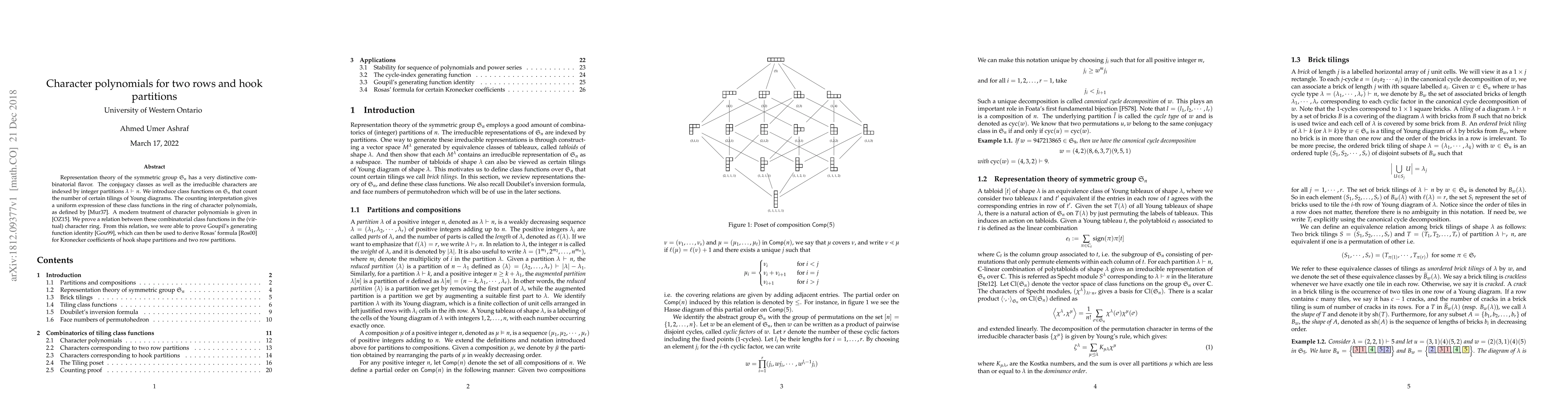 Representation theory of the symmetric group $\mathfrak{S}_n$ has a very distinctive combinatorial flavor. The conjugacy classes as well as the irreducible characters are indexed by integer partitions $\lambda \vdash n$. We introduce class functions on $\mathfrak{S}_n$ that count the number of certain tilings of Young diagrams. The counting interpretation gives a uniform expression of these class functions in the ring of character polynomials, as defined by \cite{murnaghanfirst}. A modern treatment of character polynomials is given in \cite{orellana-zabrocki}. We prove a relation between these combinatorial class functions in the (virtual) character ring. From this relation, we were able to prove Goupil's generating function identity \cite{goupil}, which can then be used to derive Rosas' formula \cite{rosas} for Kronecker coefficients of hook shape partitions and two row partitions.