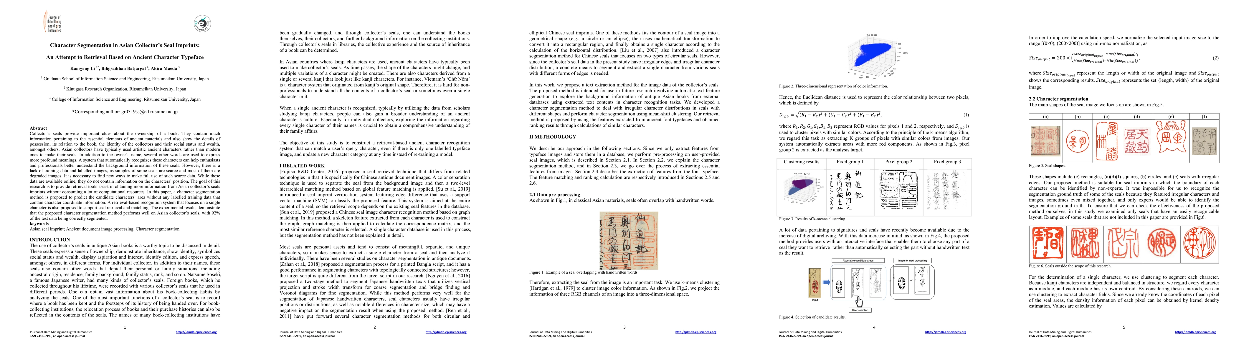 This paper proposes a character segmentation method for Asian collector's seal imprints to aid in retrieval without requiring labelled training data. The method achieves 92% accuracy in segmenting characters, enabling better understanding of the historical and social context of the seals.