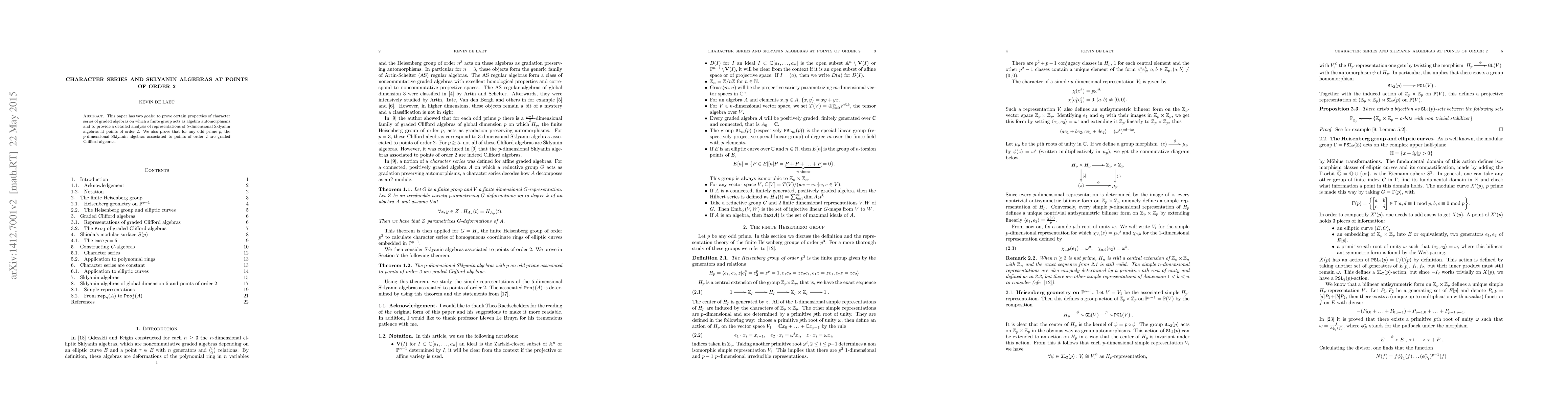 This paper investigates character series of graded algebras with finite group actions and analyzes representations of 5-dimensional Sklyanin algebras at points of order 2, proving that p-dimensional Sklyanin algebras at such points are graded Clifford algebras for any odd prime p.