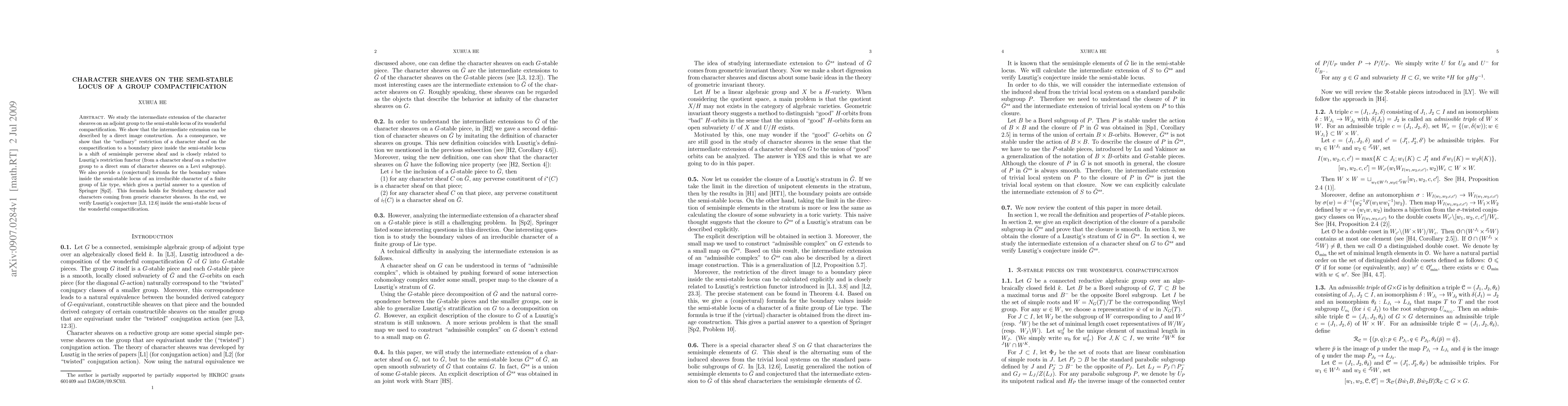 This paper investigates the intermediate extension of character sheaves on the adjoint group to the semi-stable locus of its wonderful compactification, demonstrating a direct image construction. It also connects the ordinary restriction of these sheaves to semisimple perverse sheaves and verifies Lusztig's conjecture within this locus.