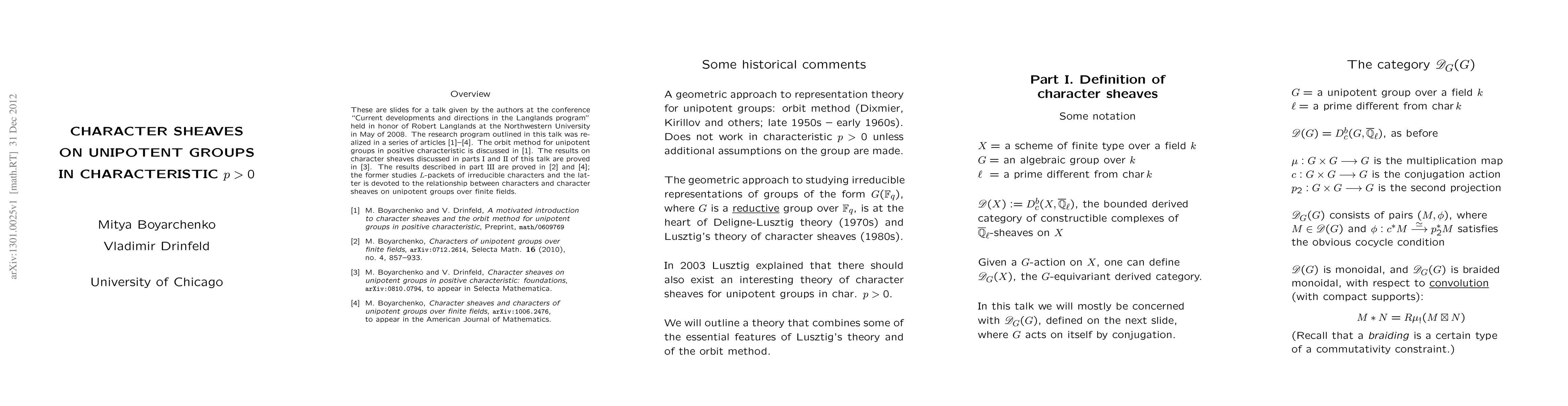 These are slides for a talk given by the authors at the conference "Current developments and directions in the Langlands program" held in honor of Robert Langlands at the Northwestern University in May of 2008. The slides can be used as a short introduction to the theory of characters and character sheaves for unipotent groups in positive characteristic, developed by the authors in a series of articles written between 2006 and 2011. We give an overview of the main results of this theory along with a bit of motivation.