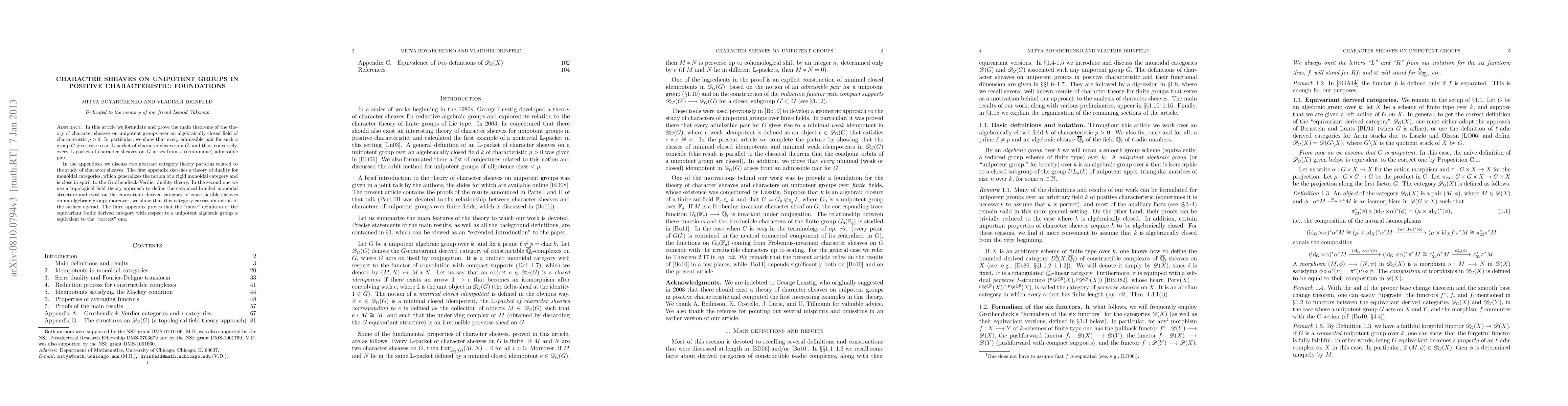 This paper establishes the foundational theory of character sheaves on unipotent groups over fields of positive characteristic, proving that every admissible pair corresponds to an L-packet of character sheaves and vice versa. Appendices explore abstract category theory, including a theory of duality for monoidal categories and a topological field theory approach to define a braided monoidal structure on the equivariant derived category of constructible sheaves.