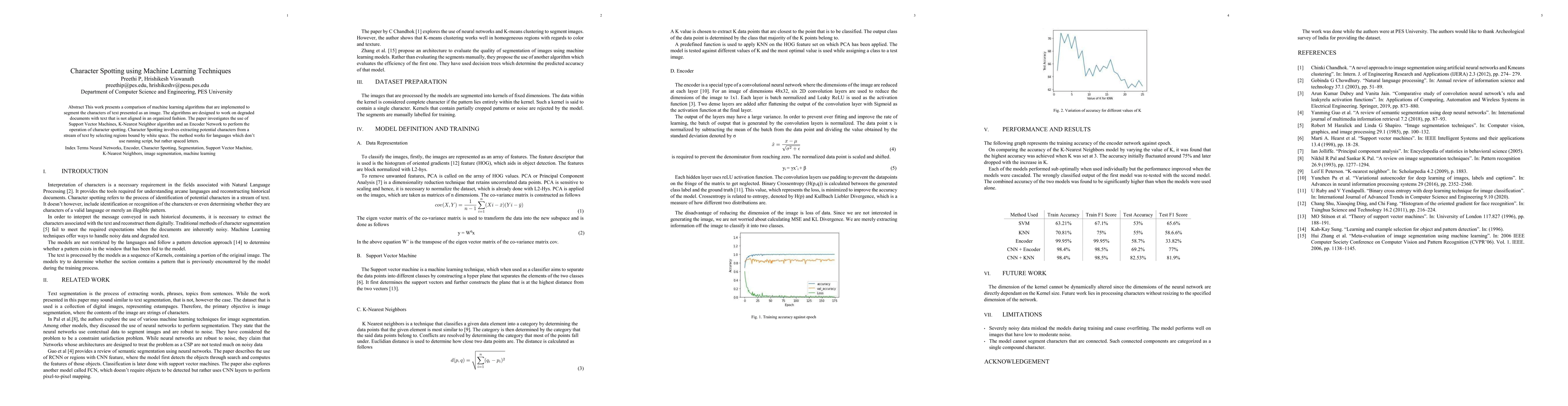 This research paper compares three machine learning algorithms to segment characters from degraded images of text, with key findings including the effectiveness of Support Vector Machines, K-Nearest Neighbor algorithm, and Encoder Network in performing character spotting.