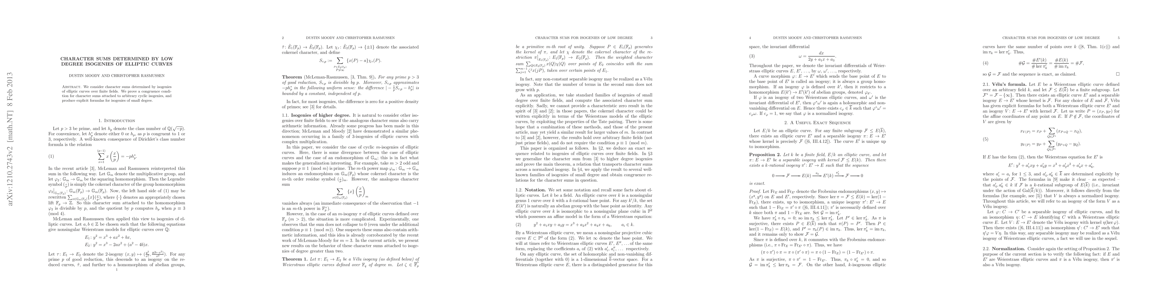 Summary: This paper investigates character sums related to isogenies of elliptic curves over finite fields, establishing a congruence condition for sums tied to cyclic isogenies and deriving explicit formulas for low-degree isogenies.
