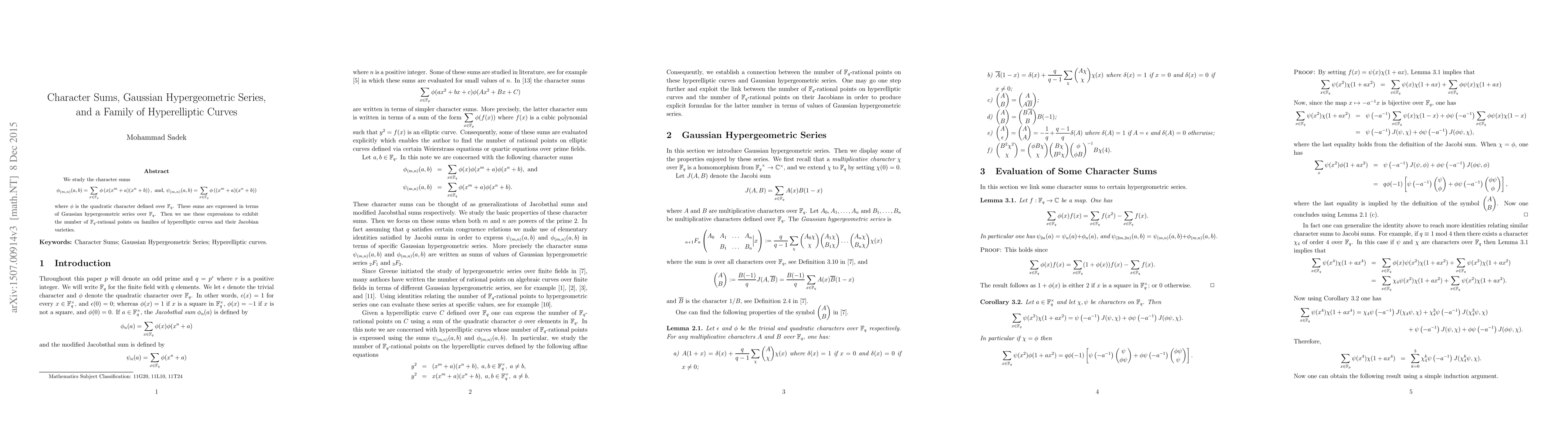 This paper investigates character sums over finite fields, expressing them in terms of Gaussian hypergeometric series, and applies these results to determine the number of $\mathbb{F}_q$-rational points on families of hyperelliptic curves and their Jacobian varieties.