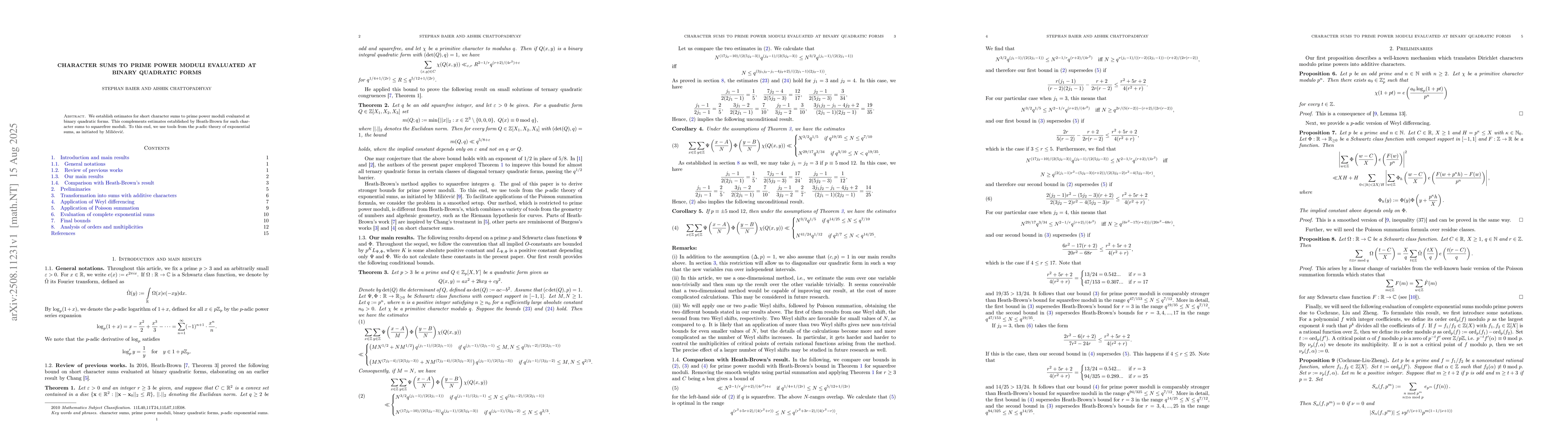 We establish estimates for short character sums to prime power moduli evaluated at binary quadratic forms. This complements estimates established by Heath-Brown for such character sums to squarefree moduli. To this end, we use tools from the $p$-adic theory of exponential sums, as initiated by Mili\'cevi\'c.