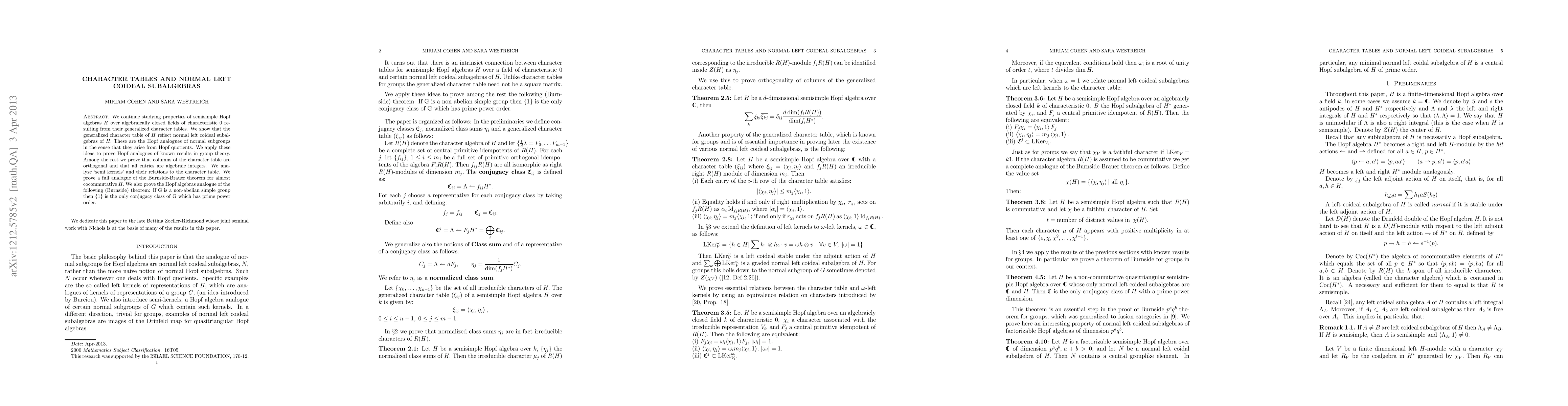 We continue studying properties of semisimple Hopf algebras $H$ over algebraically closed fields of characteristic 0 resulting from their generalized character tables. We show that the generalized character table of $H$ reflect normal left coideal subalgebras of $H.$ These are the Hopf analogues of normal subgroups in the sense that they arise from Hopf quotients. We apply these ideas to prove Hopf analogues of known results in group theory. Among the rest we prove that columns of the character table are orthogonal and that all entries are algebraic integers. We analyze `semi kernels' and their relations to the character table. We prove a full analogue of the Burnside-Brauer theorem for almost cocommutative $H.$ We also prove the Hopf algebras analogue of the following (Burnside) theorem: If G is a non-abelian simple group then $\{1\}$ is the only conjugacy class of G which has prime power order.